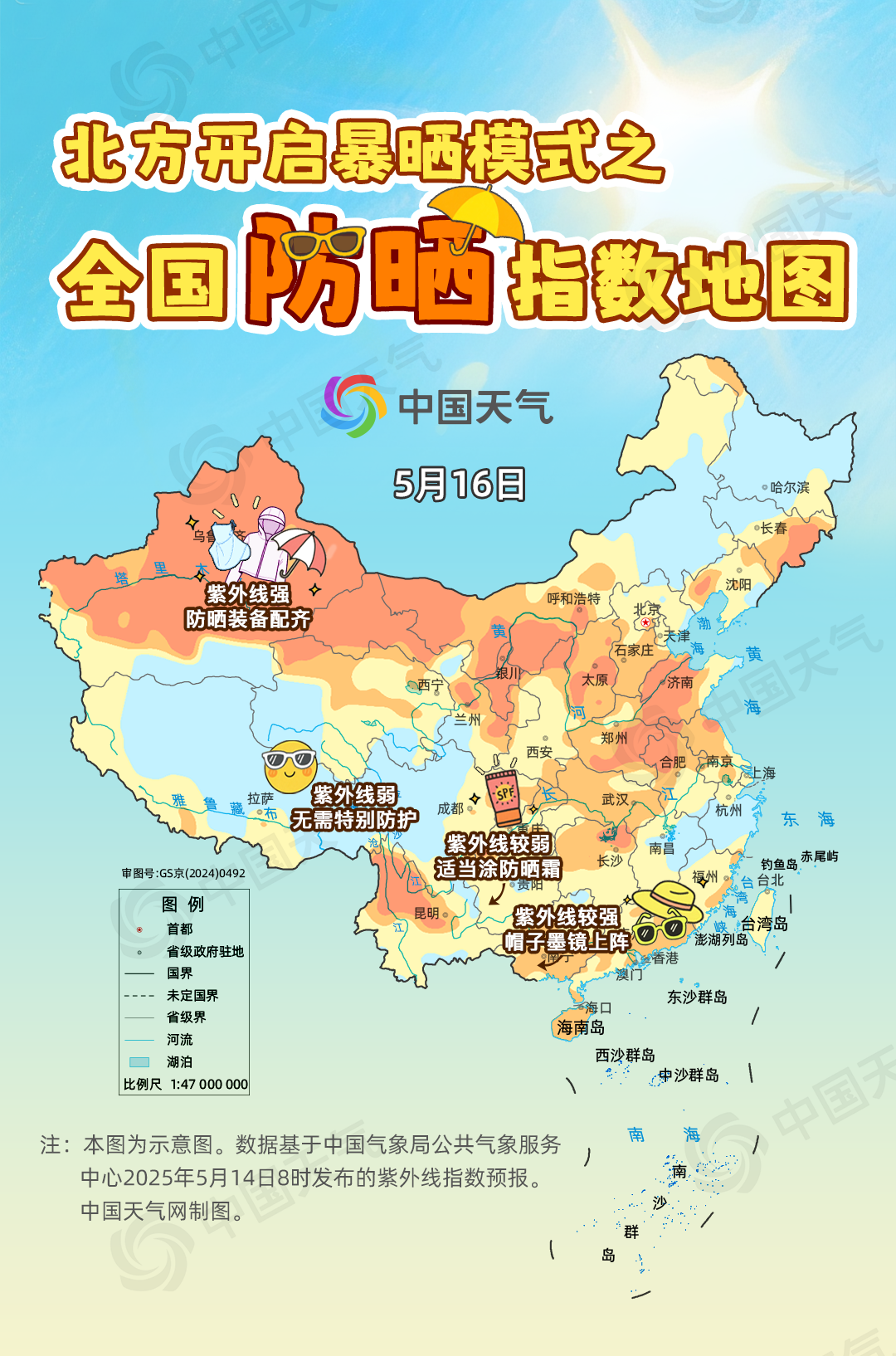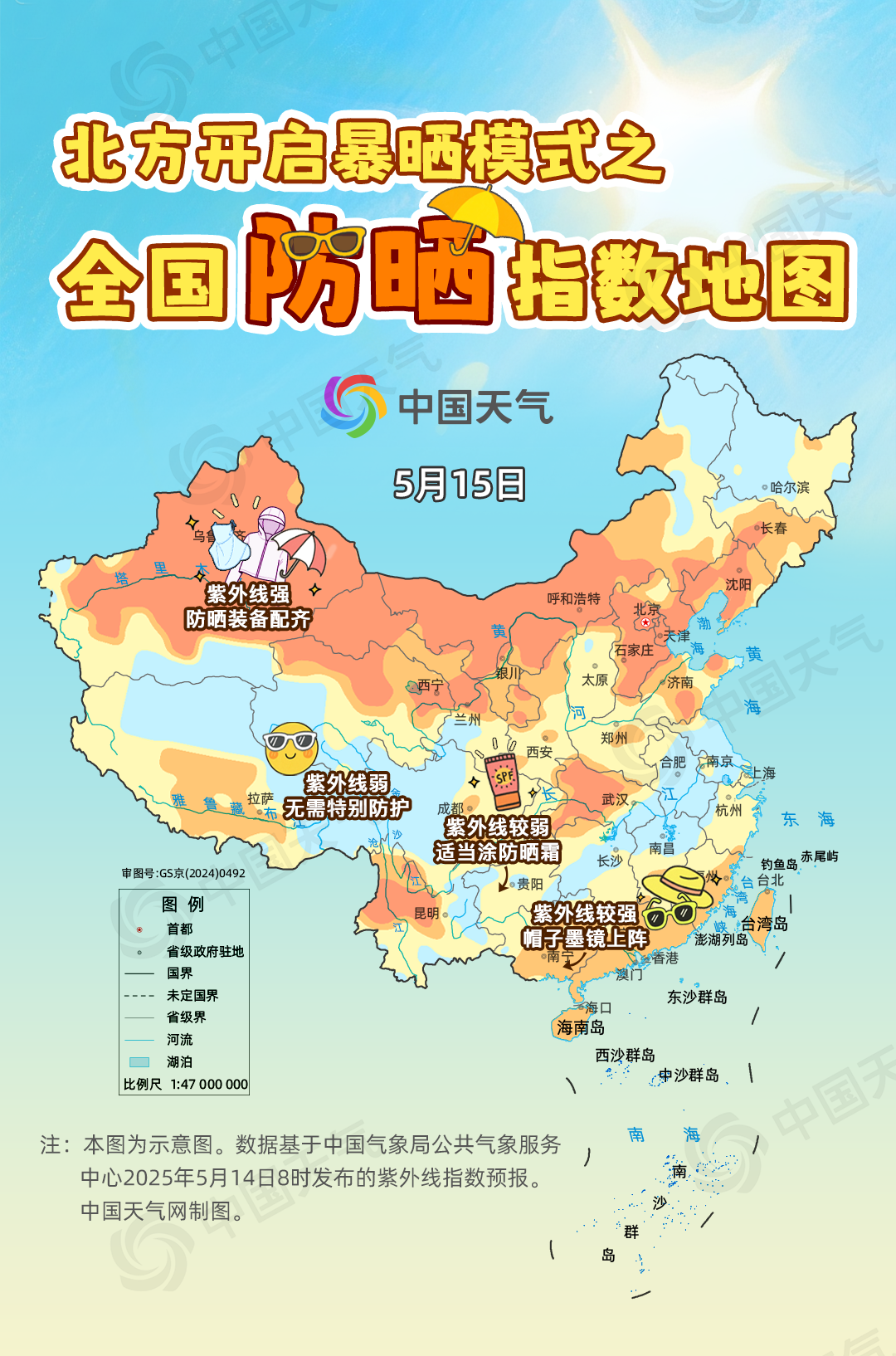 从全国防晒指数地图中可以看出,15日,新疆大部、内蒙古中西部、甘肃、河北、北京、天津、辽宁中西部和湖北、云南西北部等地以晴为主,户外紫外线强烈,防晒霜、遮阳帽、墨镜、防晒服等装备都可以用起来,主打一个“全方位遮阳”;而安徽、江苏、江西北部、四川西部、西藏中东部、黑龙江东部等地受降雨影响,紫外线弱,无需特别防护,若长期在户外,建议涂抹低倍防晒护肤品。