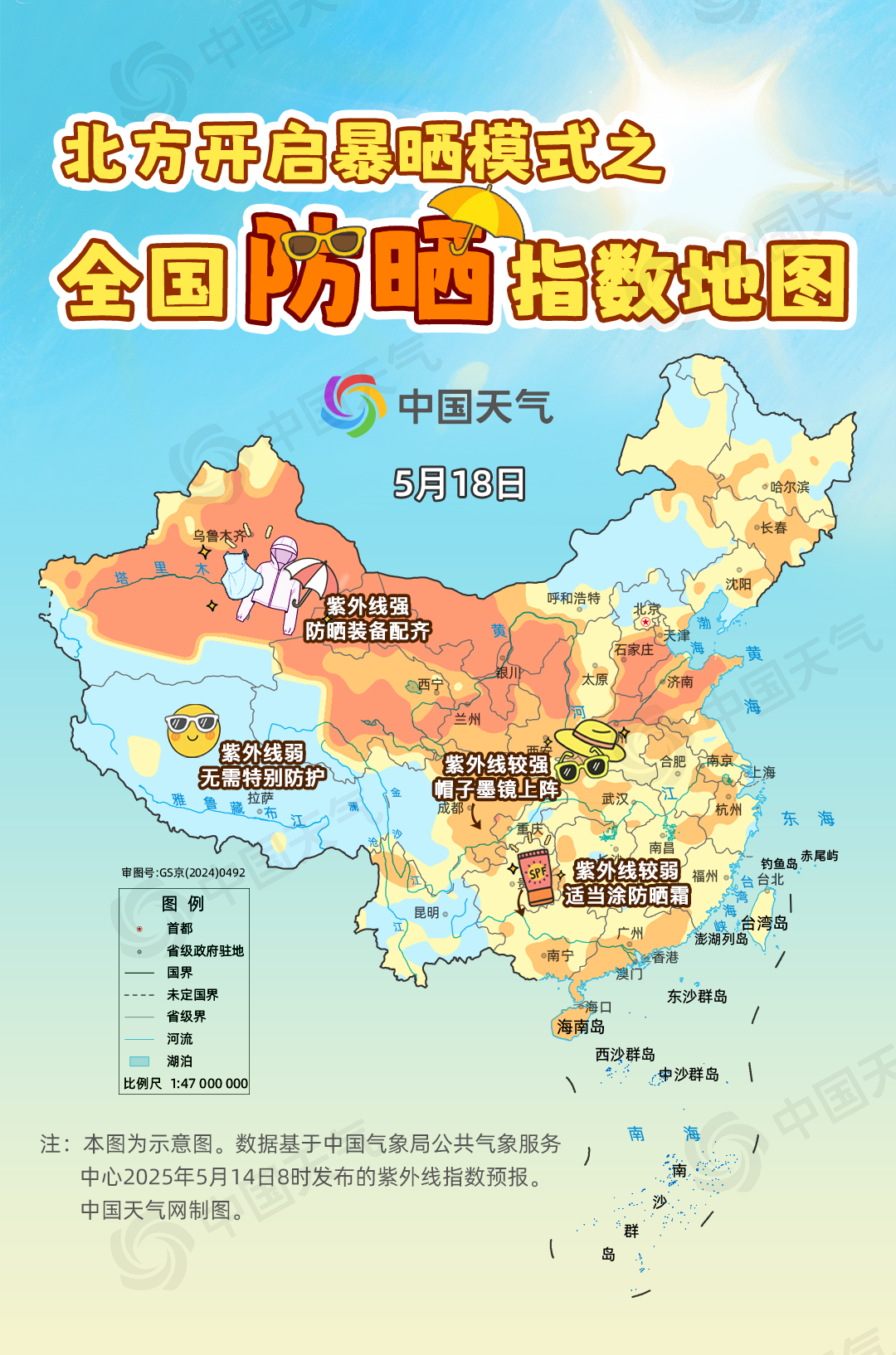 18日,西北地区大部和河北、河南北部、山东等地紫外线强,午后外出,需注意全方位防御;南方大部地区的紫外线相对弱一些,如要外出,也需适当涂抹点防晒霜。