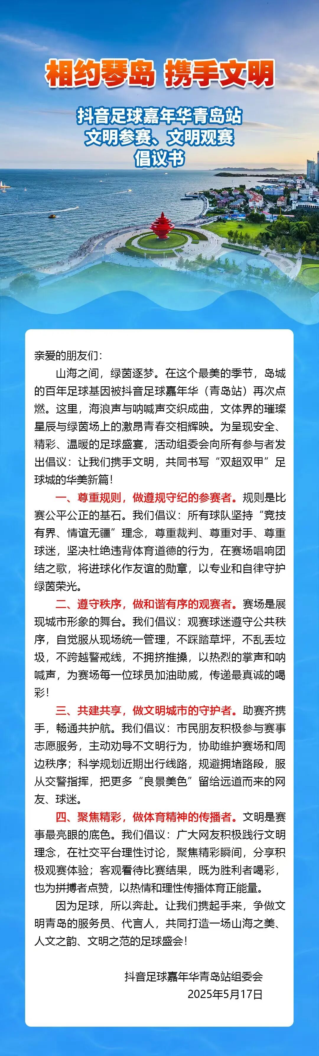 为了保证到场球迷的安全及观赛体验,抖音足球嘉年华青岛站活动组委会发出倡议,让我们一起“相约琴岛携手文明”。