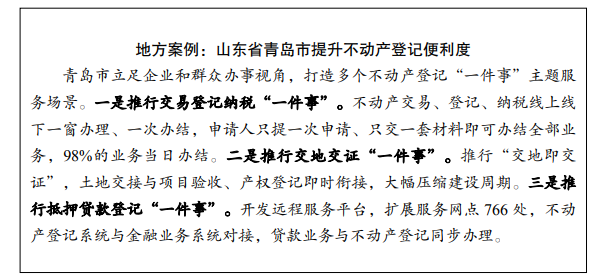 近日,国家发展改革委发布《中国营商环境发展报告(2025)》,这是营商环境领域权威的全国层面报告。报告按照企业从设立到退出的全生命周期,分5个部分展示2024年全国层面营商环境各领域进展成效,择优遴选了北京、上海、山东等16个地方典型案例,在全国范围内复制推广。“山东省青岛市提升不动产登记便利度”作为不动产登记领域内全国唯一案例入选。