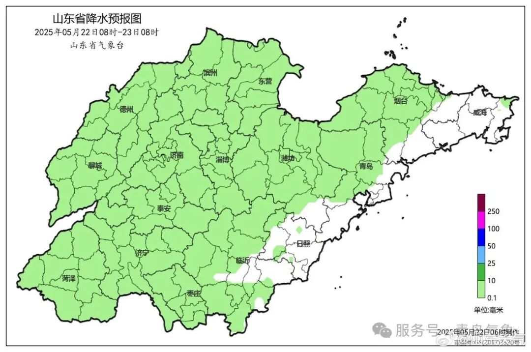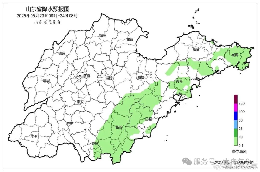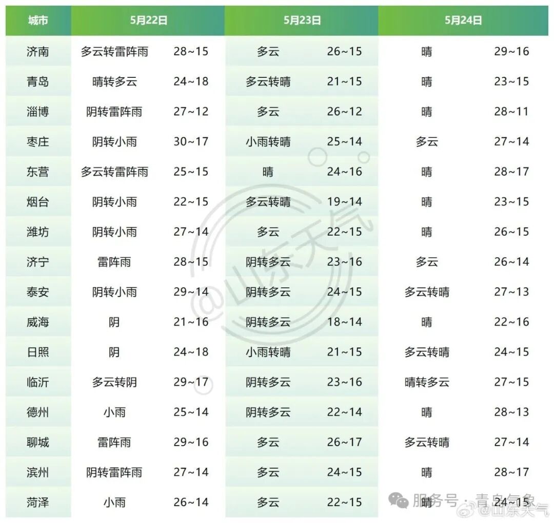 22日白天至23日早晨,我省自西向东有一次雷雨或阵雨天气过程。其中22日菏泽、济宁、鲁西北、鲁中和半岛地区有雷雨或阵雨,23日临沂、日照和半岛地区天气阴局部有阵雨转多云;24日全省天气晴间多云。