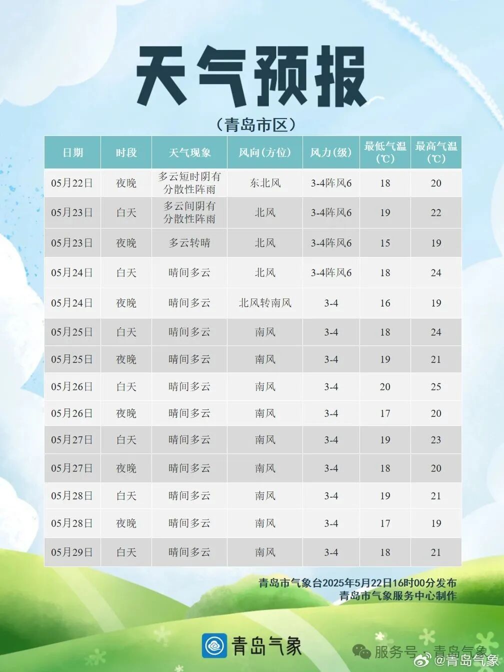 今天(22日)夜间到明天白天,我市上空云量增多,偏西、偏北部地区有阵雨,其他地区分散性阵雨,偏北风的阵风风力较大;各区市的最高气温明显回落,在20~22℃之间。本周末岛城是多云到晴的天气,风力大多在3~4级,市区最高气温保持在24℃上下;内陆地区的最高气温日渐上升,到了周日会升到26~30℃,周末外出请注意防晒和补水。
