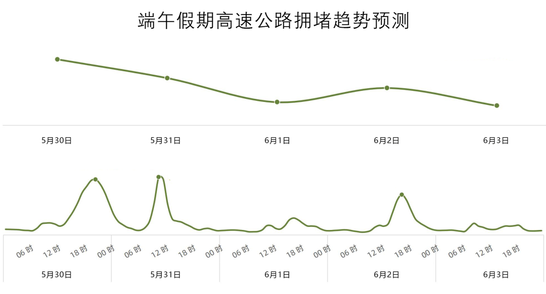 根据往年假期出行规律,端午假期前一天(5月30日)和假期首日(5月31日)都将迎来出程高峰。假期前一天高速拥堵里程占比大概率高于假期第一天,当天14时开始,高速公路交通压力逐渐增大,18时-22时拥堵程度较高,峰值或将出现在20时-21时。假期首日为第二次出程高峰,9时-13时是拥堵高峰时段,峰值或将出现在10时-11时。预计假期最后一天(6月2日)15时-18时为返程拥堵高峰,峰值预计将出现在16时-17时。提醒市民提前合理安排时间,错峰出行。
