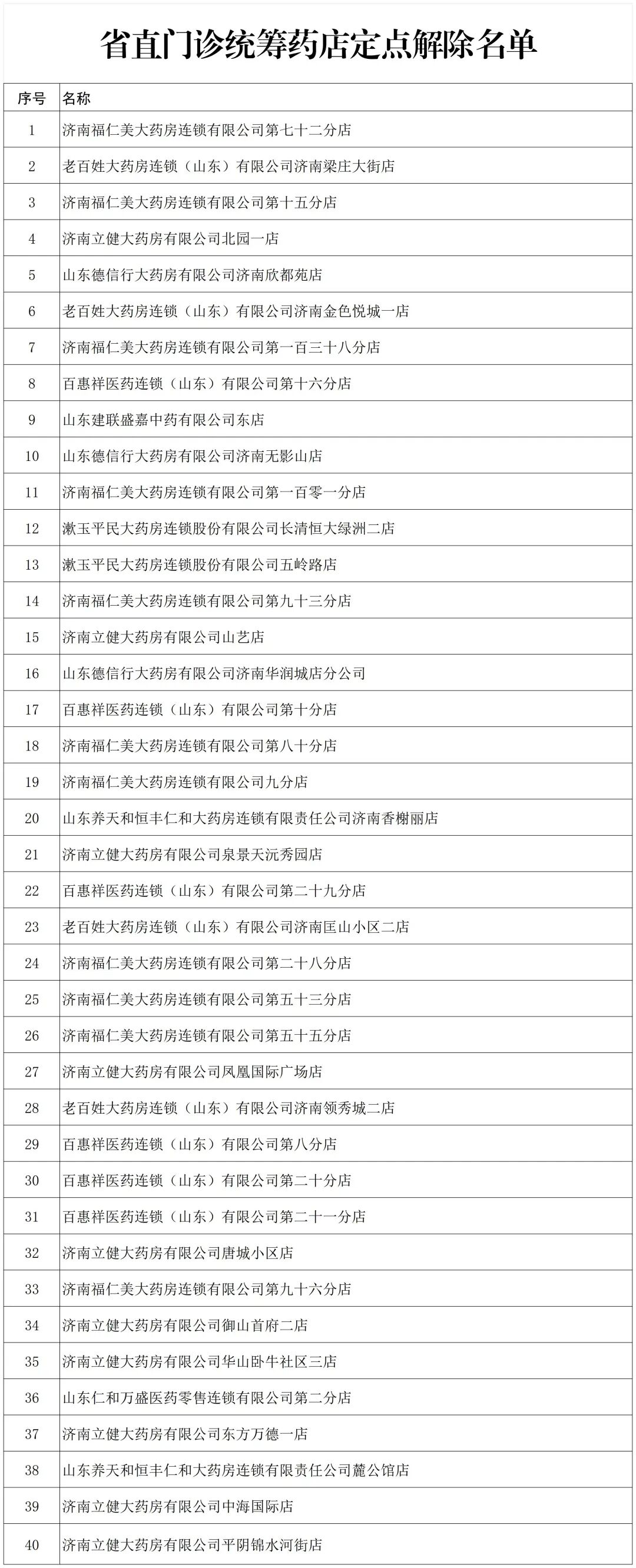 根据《零售药店医疗保障定点管理暂行办法》(国家医疗保障局令第3号)及省直医保服务协议等有关规定,我中心正式解除与济南福仁美大药房连锁有限公司第七十二分店等40家省直医保门诊统筹药店的医保协议关系,详情见附件。