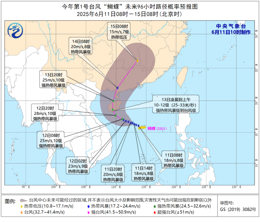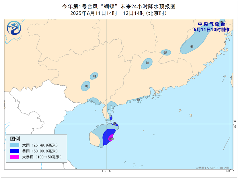 据气象部门预测,今年第1号台风“蝴蝶”已于6月11日8时生成,预计将于13日凌晨到上午在海南岛南部沿海登陆(强热带风暴级到台风级),受其影响,11日14时至12日14时,南海大部、北部湾、琼州海峡、西沙群岛、南沙群岛、中沙群岛、广东沿海、海南岛沿海将有6-8级风,阵风9-10级,台风中心经过的附近海域风力可达9-10级,阵风11-12级。海南岛中东部的部分地区有暴雨或大暴雨(100-150毫米)。