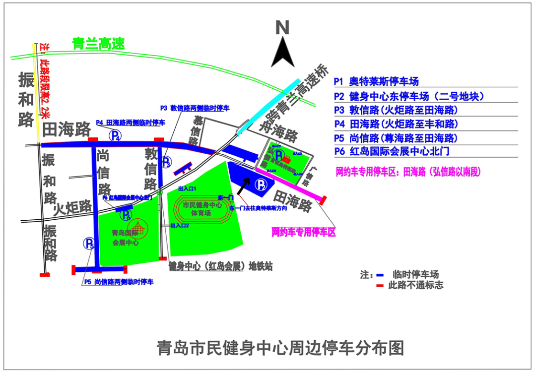 2. 敦信路、田海路、尚信路区域的停车场,可根据现场标识引导,经健身中心北门、西门前往。