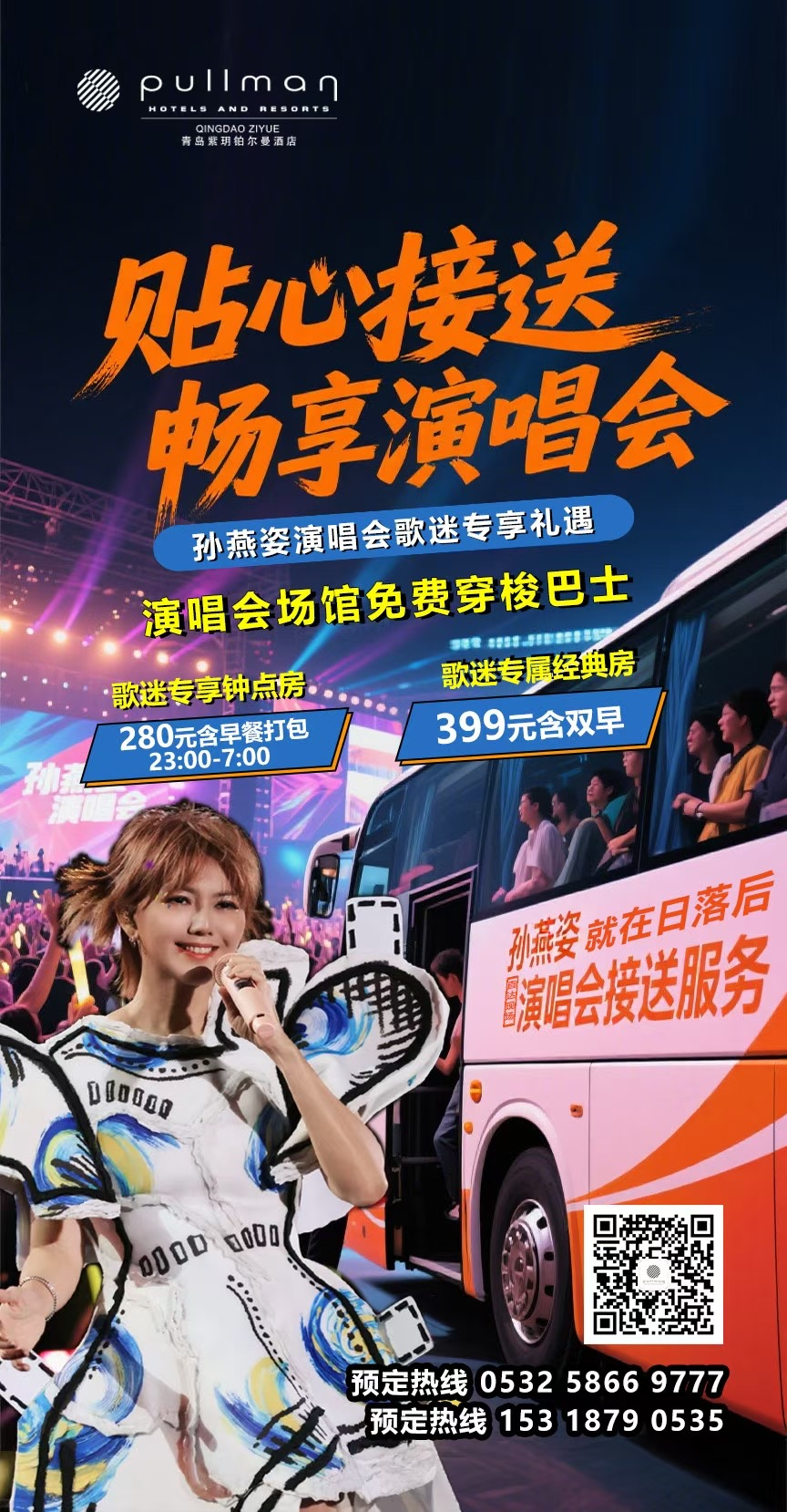演唱会期间,凭本人演唱会门票订房享受88折优惠并赠送自助早餐一份;酒店抖音、小红书拍摄打卡可获得惊喜应援礼包;粉丝会订房20间以上享受接送服务。