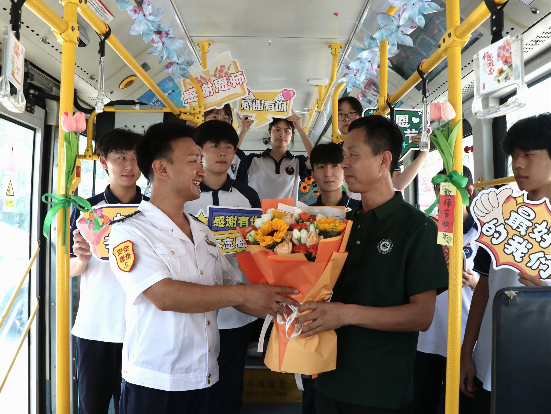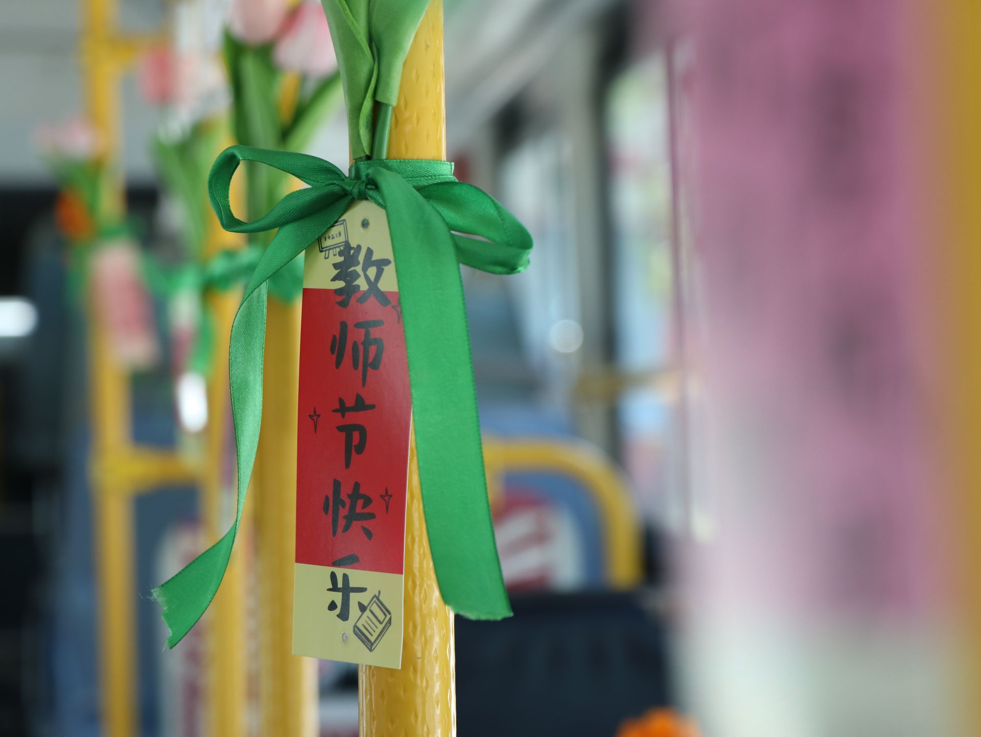 9月8日9时,“感动青岛”道德模范、302路驾驶员董述飞驾驶着DD636号先锋巴士,缓缓驶入他的母校——青岛工贸职业学校。董述飞与学生们默契配合,精心布置“感恩有您”主题车厢,在车厢内悬挂着鲜艳的节日横幅,手拉宝上贴满了学生们亲手绘制的教师节贺卡,手扶杆和座椅靠背上的郁金香与向日葵相映成趣,让整个车厢充满生机与暖意。