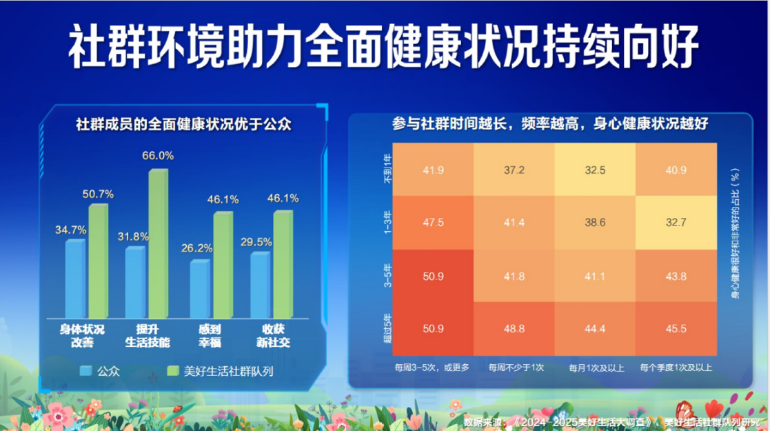 美好生活队列的初步研究揭示:良好社会关系是美好生活重要维度。现代化进程中现实世界与虚拟世界交织发展,人际关系联接的样态正在被重塑,正深刻影响着美好生活的创建。以“兴趣交友、以健康为伴、以美好共情”的社群,基于兴趣爱好、健康生活和情感链接,已成为促进公众实现美好生活的新型社会支持网络。长期参与活动社群的人群,在身体健康、情绪健康、社交收获、个人成长、创业技能等方面均显示出更强优势。