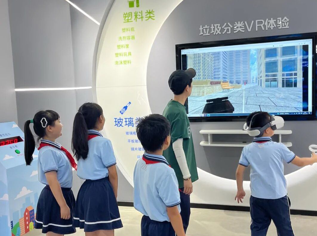 互动体验环节中,学生们在讲解员引导下,通过“小猪分类法”轻松掌握分类技巧,还踊跃参与“垃圾再利用”“垃圾飞行棋”“VR垃圾分类”“触感游戏”等项目。展馆内“变废为宝”的手工艺品同样吸引着大家的目光——绿色塑料瓶盖拼贴的手提包、废纸壳拼接的小房子、铁丝与瓶子制作的小台灯,让学生们真切感受到资源循环利用的意义。戴上VR眼镜,学生们在虚拟世界中“捕捉”苹果核、作业本、饼干袋、废电池等垃圾,准确投入对应垃圾桶;大屏幕上的垃圾分类智力小游戏,通过触摸互动与得分比拼,让大家在欢笑中牢记分类知识,还培养了反应力与团队协作能力。