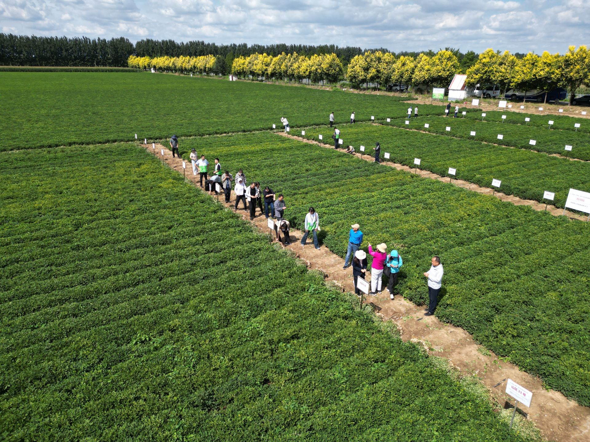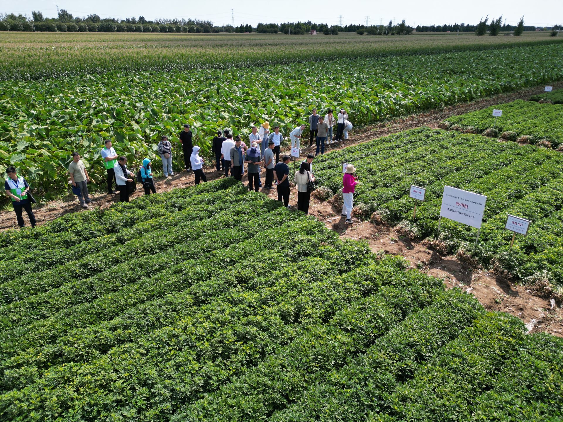 花生新品种展示评价与试验示范现场,共分3个板块:新品种展示评价、优良新品种试验示范和高油酸花生绿色高质高效栽培大面积试验示范。今年花生新品种展示由上级业务部门——山东省种子管理总站发通知在全省范围征集,19家科研、种企、合作社参展品种43个,这块试验田共展示示范新品种66个,涵盖携带高油、高油酸、高蛋白、鲜甜适口、高花青素等优良性状及组合的优良新品种。