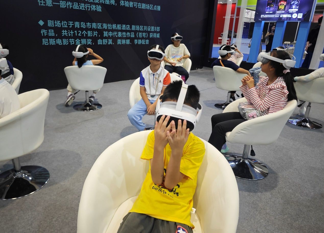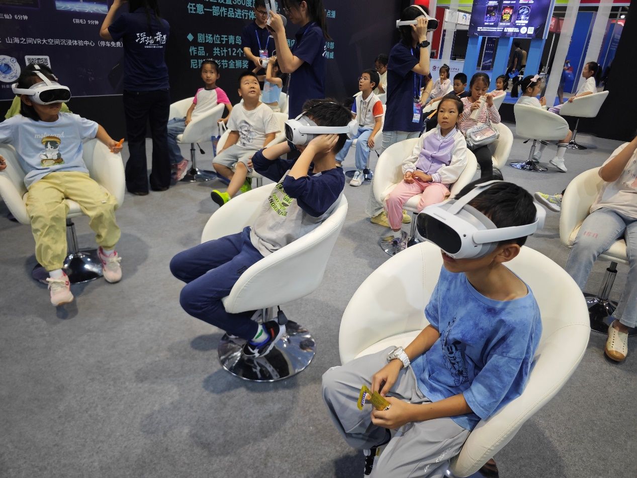 研学的最后一站,小记者们走进青岛国际VR沉浸影像展展区。作为电博会重点项目,这里带来了《苍穹》《纸鹤》等国际A类电影节获奖VR作品,还有“星际三部曲”“万物起源”等特色体验项目。
