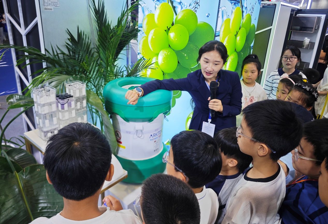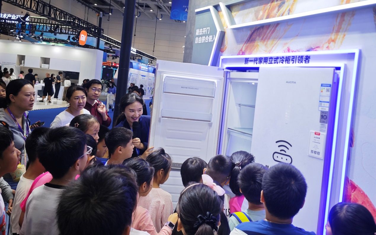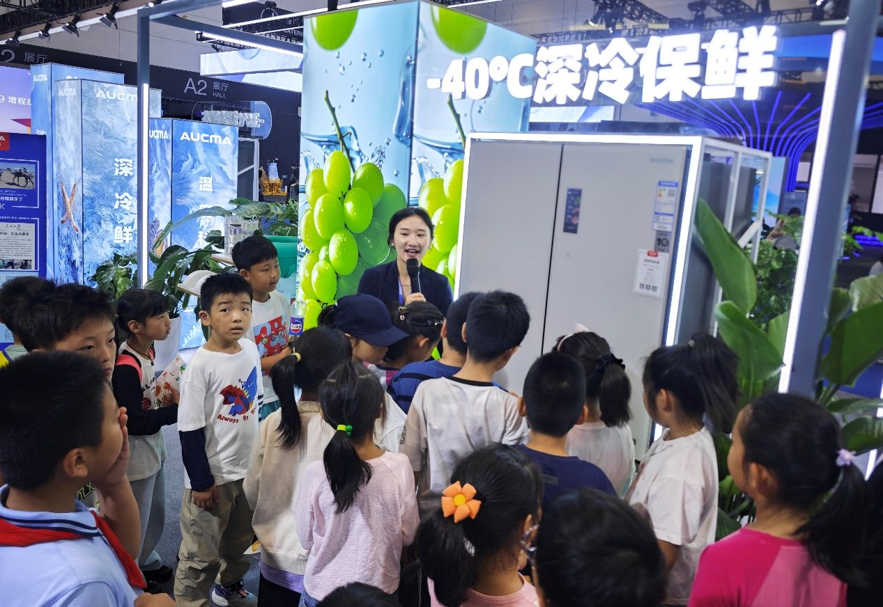 冷链与家电展区的硬核产品更让大家驻足。小记者们观看了可以达到-40℃度的深冷保鲜冰柜,并了解到平嵌鲜活冰箱超薄机身实现厨居一体化,深冷锁鲜技术与分区设计,可以让绿叶菜保鲜期延长3倍、鲜肉无需冷冻可存7天。林昊老师介绍,这些成果源于澳柯玛在低温制冷、绿色节能、智慧物联等十几项领域的深耕,众多专利加持下,多款产品达国际领先水平。