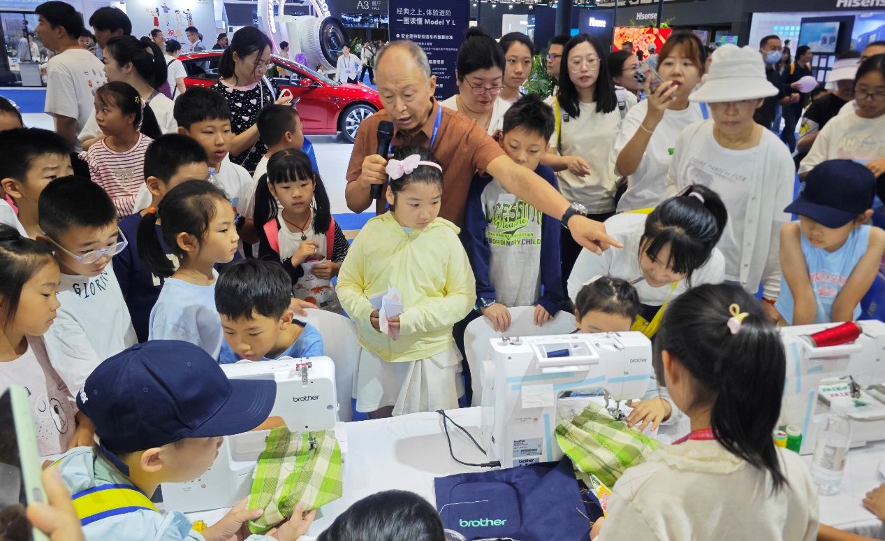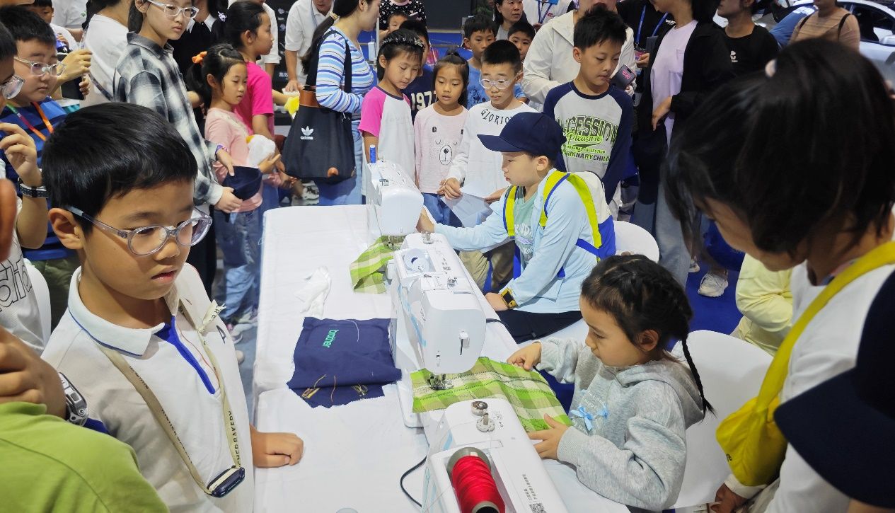 缝纫设备区,缝纫机的彩色液晶触摸屏操作直观,缝绣一体机的上百种针迹、各种绣花花样,让大家感受到传统缝纫与现代科技的巧妙融合。“原来衣服上的花纹、帽子上的图案,都能靠这些机器轻松实现!”一位小记者感慨道。工作人员现场演示将卡通图案印在棒球帽上,赠予每位小记者,大家捧着专属定制礼品,脸上满是喜悦。