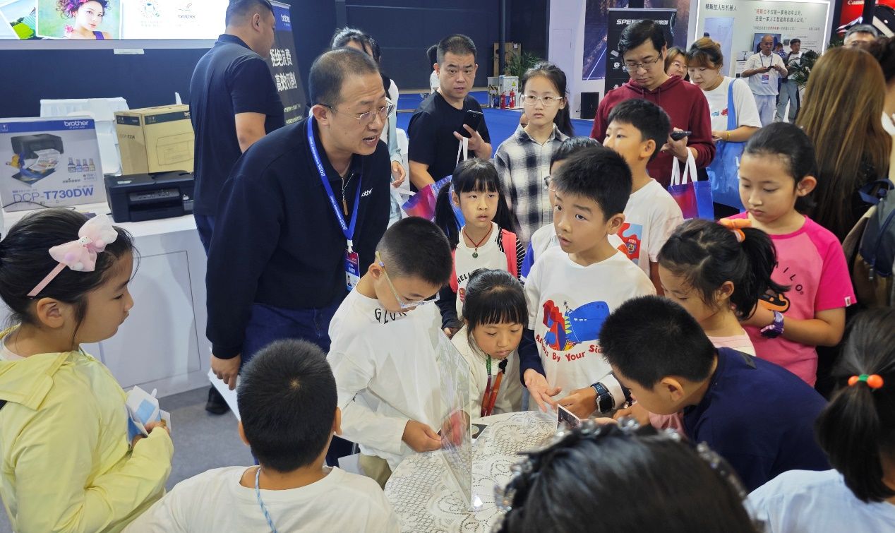 第三站,小记者们走进日本兄弟公司展位,聚焦智能打印与缝纫科技。数码打印机率先吸引目光,环保水性颜料墨水打印出的图案色彩饱满。
