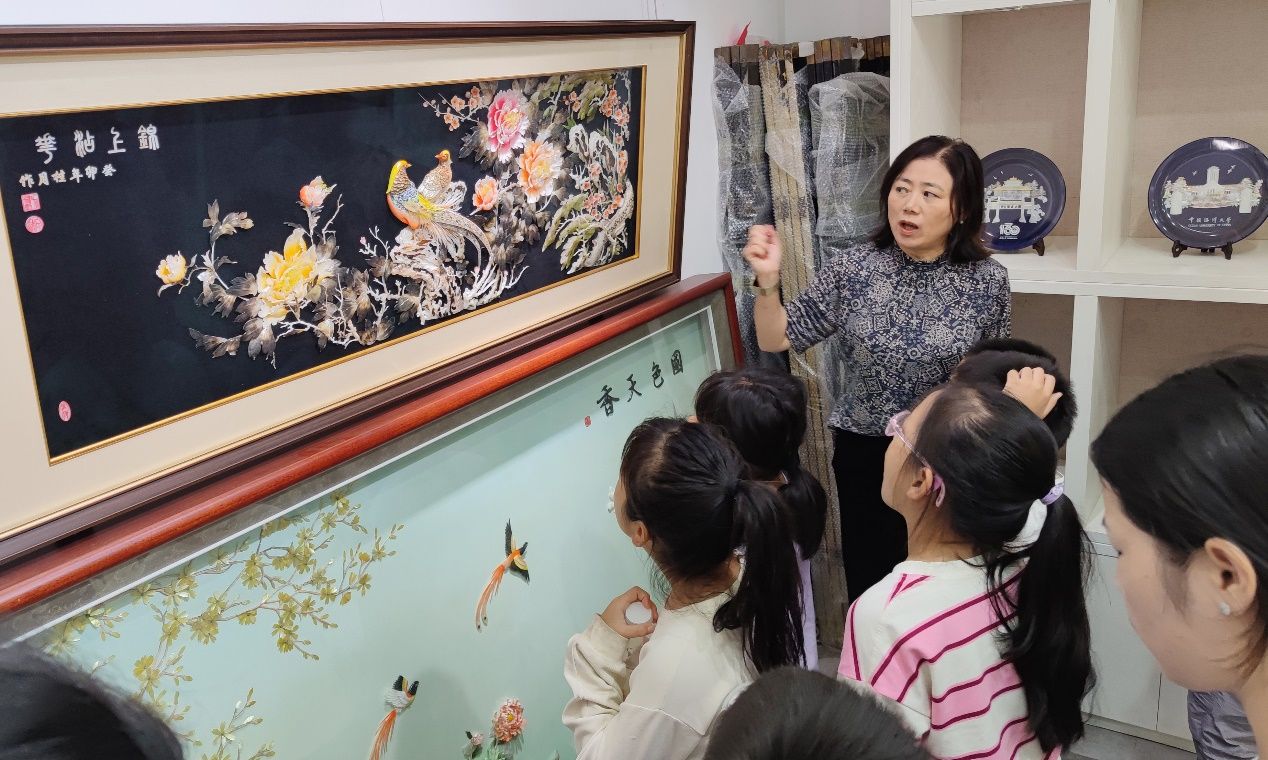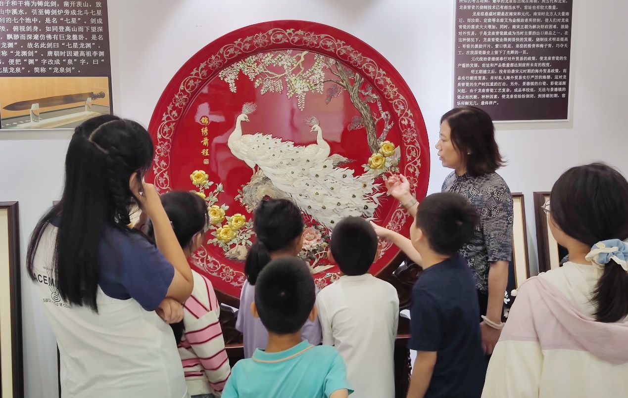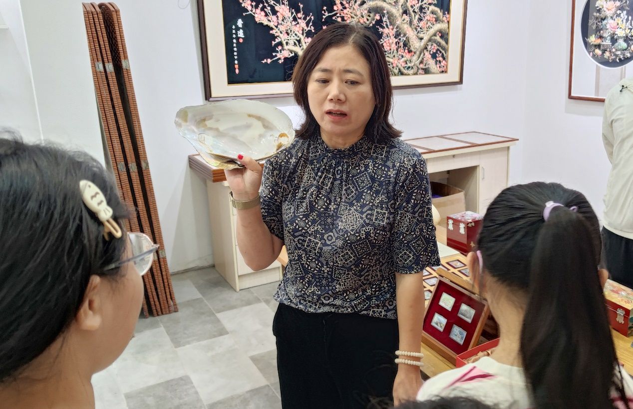 在青岛臻艺贝雕艺术交流中心,讲解员崔冬梅老师开篇提问便点燃了小记者的好奇心:“大家知道吗?青岛贝雕的历史能追溯到五万年前的山顶洞人时期,那时的人们就用贝壳制作装饰品了!”随着讲解深入,贝雕从古老装饰到现代艺术品的演变脉络逐渐清晰,而生产车间里展示的选材、设计、雕刻、打磨等工序,更让“一片贝壳变艺术品”的神奇过程直观呈现在眼前。