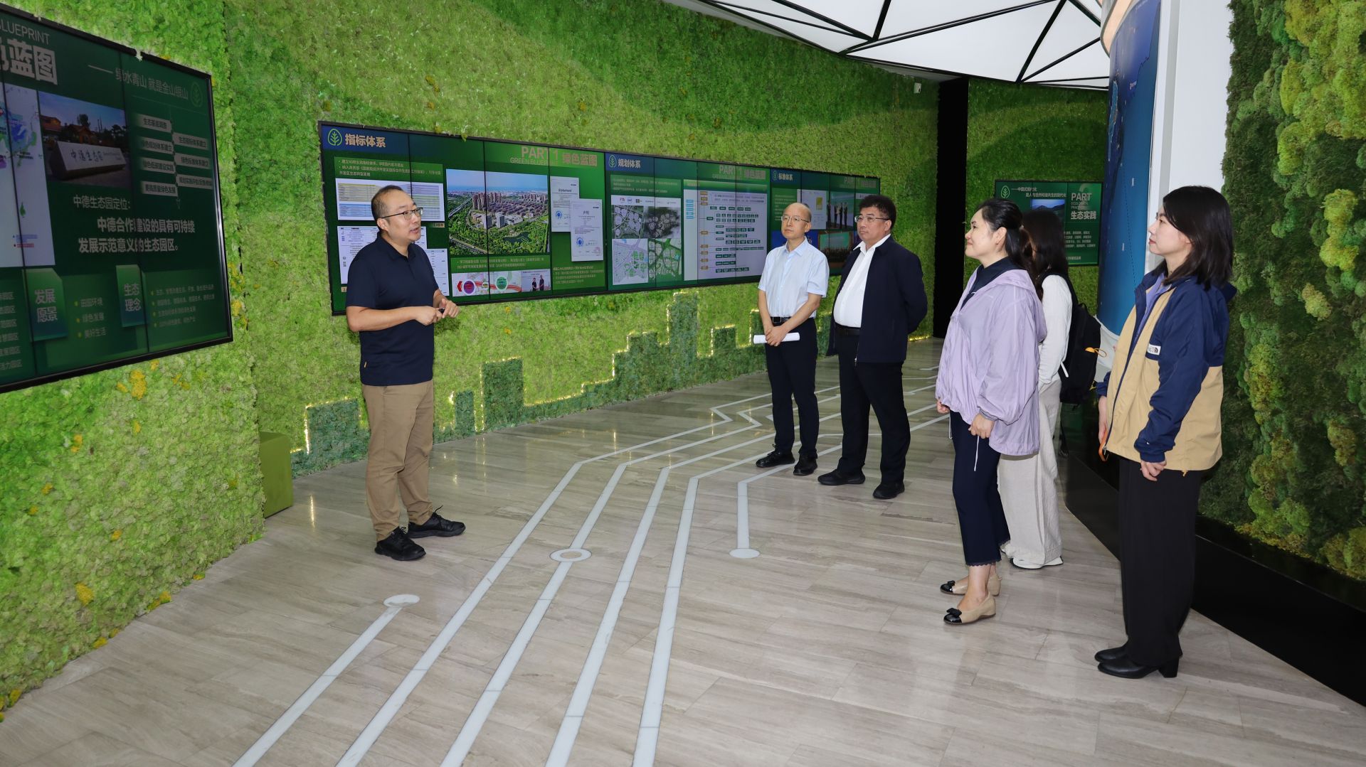 在中德生态园,调研组参观了体验运营中心,观看《自然会发生》《中德生态园十周年》等生态文明主题宣传片,并通过实景沙盘和互动设施深入了解园区在低碳城市建设、绿色规划展示、智慧运营管理等领域的实践成果。中德生态园生态规划建设部负责同志系统汇报了园区生态文明宣教总体情况,重点介绍了以“管委会+企业+社会公众”多元协同的宣教体系、专业化场馆建设、国际交流平台搭建以及特色宣传活动开展情况。
