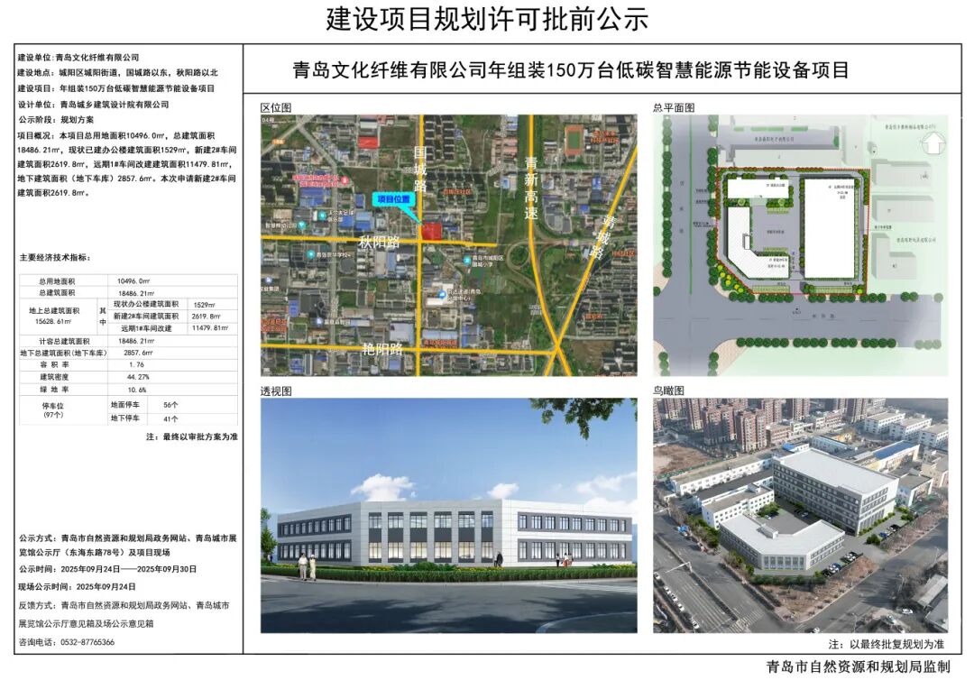 与此同时,青岛文化纤维有限公司在城阳区城阳街道国城路以东、秋阳路以北建设的年组装150万台低碳智慧能源节能设备项目也同步公示。