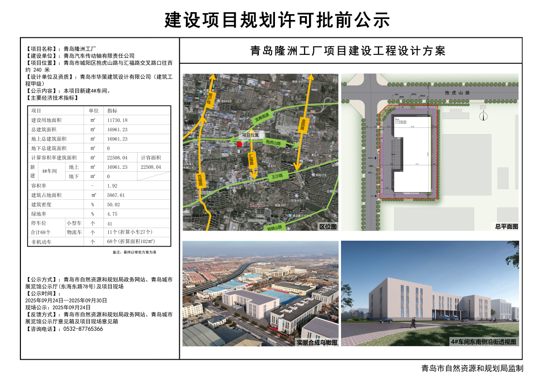 记者获悉,青岛隆洲工厂项目由青岛汽车传动轴有限责任公司建设,项目位于城阳区抱虎山路与汇福路交叉路口西侧约240米处。该项目由具备建筑工程甲级资质的青岛市华策建筑设计有限公司负责设计。