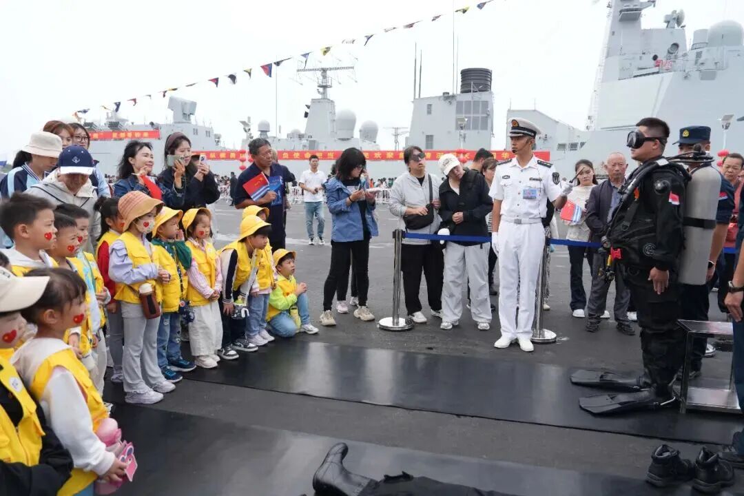 码头设置的海军特色科目展示区成为互动热门点位。观众们与官兵近距离交流,亲身参与系绳结、打旗语等体验,还试穿了防火服和潜水装具,在实操中学习海军专属技能,沉浸式感受海军特色文化。与此同时,军民互动演出轮番登场,激昂的军乐演奏与精彩的文艺展演赢得阵阵掌声,军民同心的氛围十分浓厚。