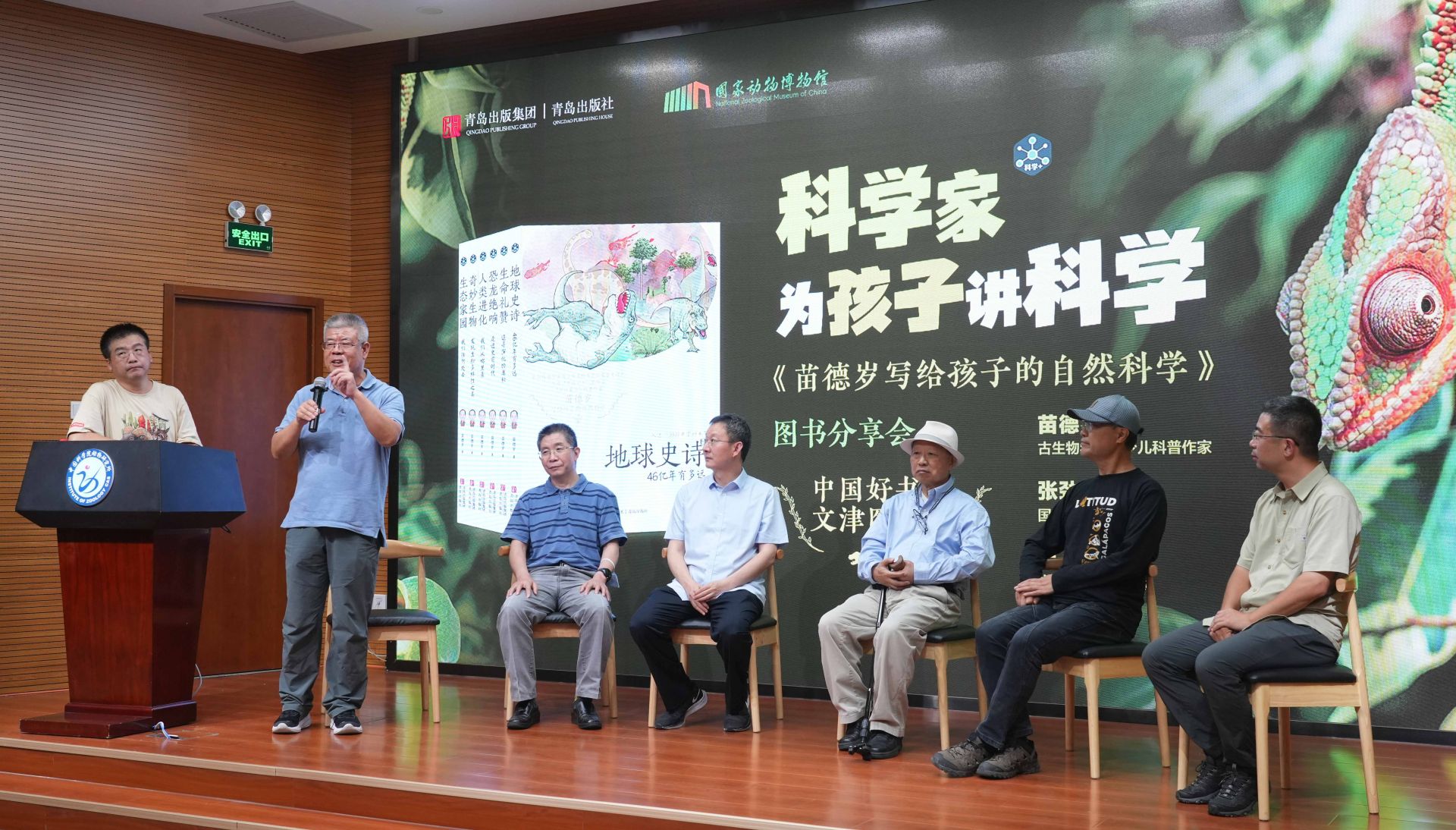 2024年9月10日晚,青岛出版社与国家动物博物馆联合主办《苗德岁写给孩子的自然科学》图书分享会。左起:国家动物博物馆馆长张劲硕、山东大学教授王德华、中国科学院动物研究所研究员张德兴、中国科学院院士徐星、本文受访者苗德岁、北京大学教授刘华杰、科普专家史军。