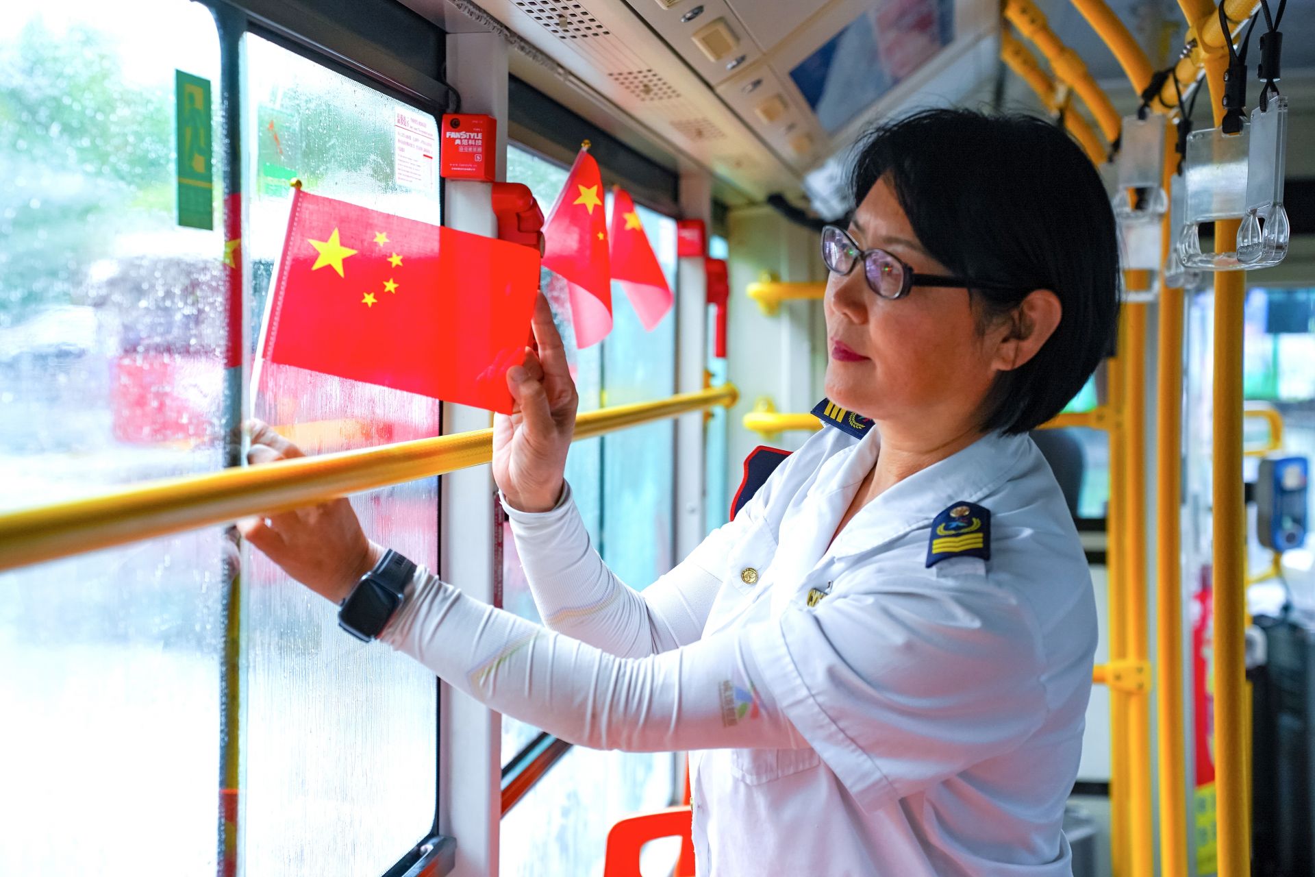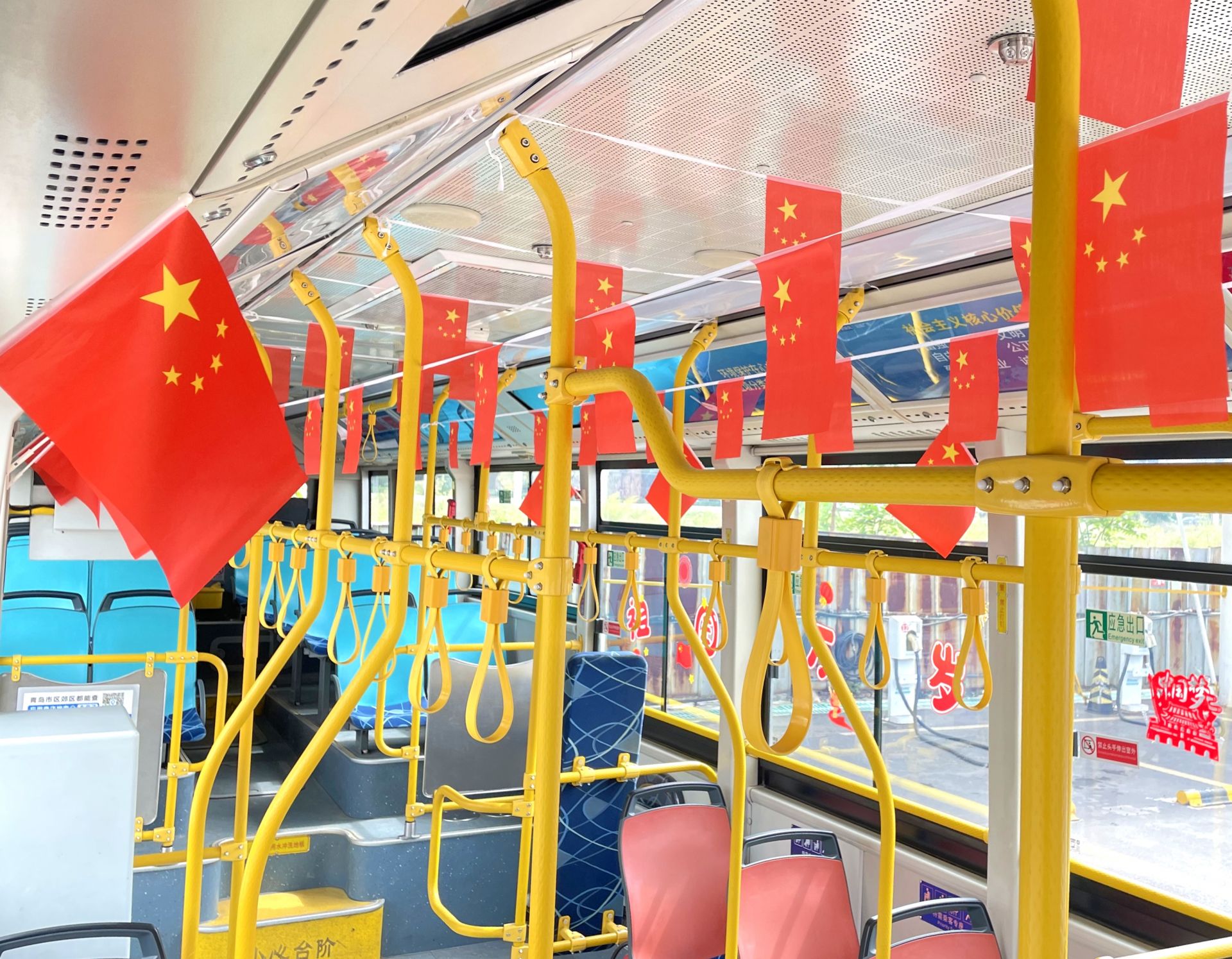 “您好!请扶稳坐好,咱们这趟‘国庆主题车’马上出发啦!”9月28日清晨的四方宣化路站台上,1路驾驶员续宗政热情洋溢地问候,开启了乘客们惊喜的旅程。记者走进车厢,浓郁的节日氛围扑面而来:扶手杆上整齐缠绕着鲜红的国旗,车窗玻璃贴着“欢度同庆”“我爱你祖国”的红色贴纸,车顶悬挂着祝福条幅,整个车厢被装点成移动的“红色空间”。