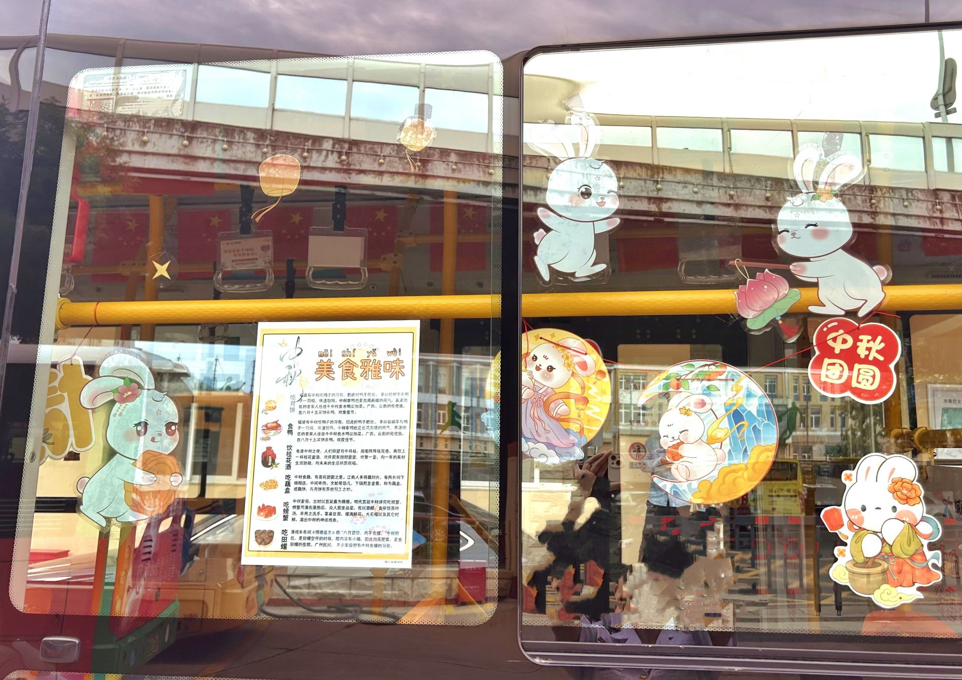 这样的温馨场景在青岛的多条公交线路上同步上演。326路“情暖中秋 喜迎国庆”主题车厢内,鲜艳的国旗挂满车厢两侧,与车内灯光交相辉映;“祝福祖国”“我爱中国”等金色标语传递着浓浓的爱国情怀。巧妙融入的中秋元素更添温馨——扶手上的玉兔玩偶俏皮可爱,车窗上的圆月贴纸与窗外阳光相互映衬,共同编织出团圆祥和的节日图景。