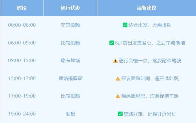 易拥堵时段:9点-11点,15点到17点为全天车流高峰,建议错峰出行。