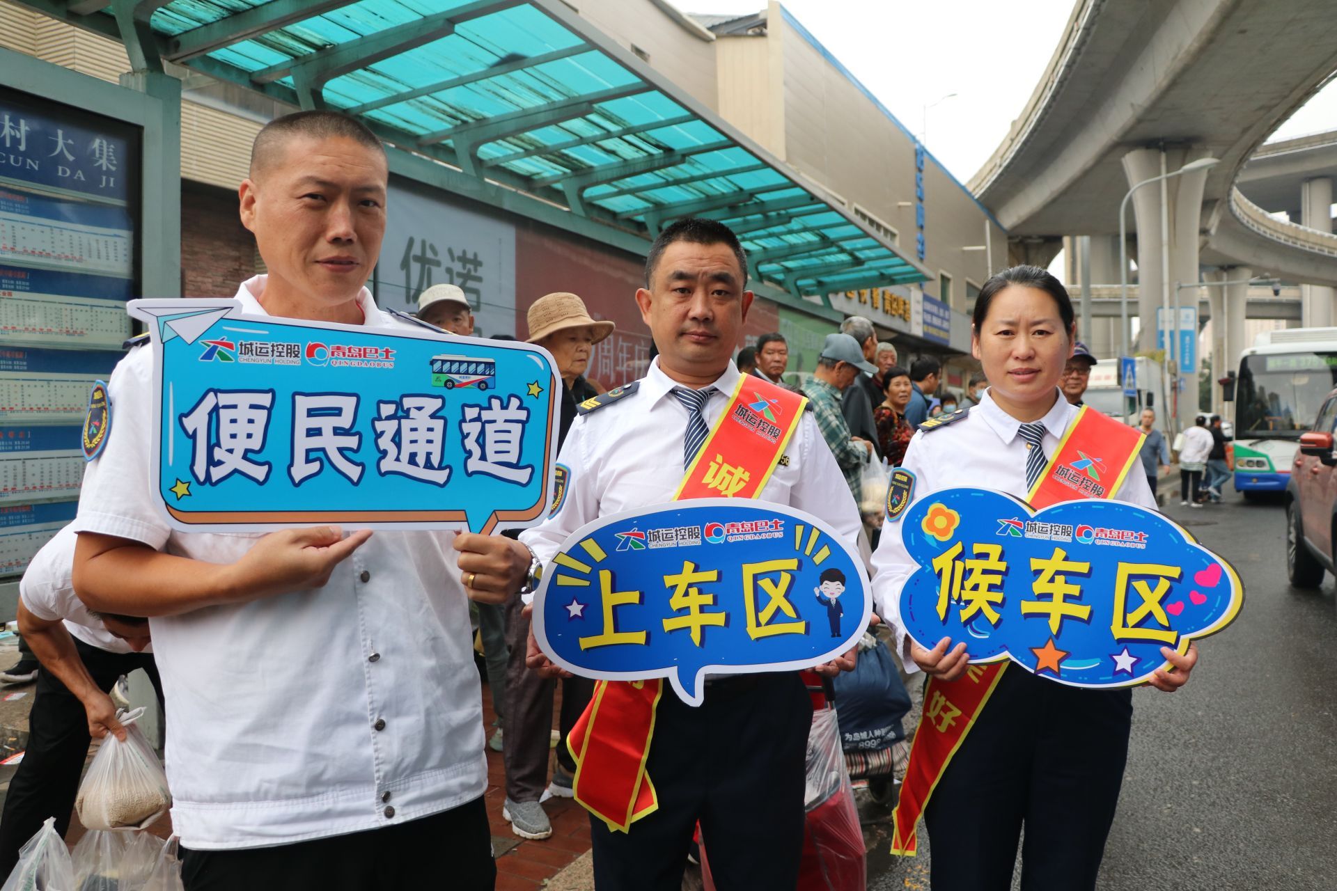 为解决李村大集站“上下车拥挤、站点秩序混乱”的问题,公司每次安排4名“青岛巴士”志愿者在现场值守,通过设置临时引导标识,用清晰的标线划分出“上车区”“等候区”和“便民通道”,引导乘客有序排队、实现“先下后上”的良性循环。志愿者们主动帮助携带大量农副产品的市民搬运物品,对特需乘客给予重点帮扶。同时,将职责范围延伸至站点周边道路,协助疏导交通,规范社会车辆停放,有效避免了车辆占道影响公交车正常进出站,形成了“站点有序、道路畅通”的高效营运环境。