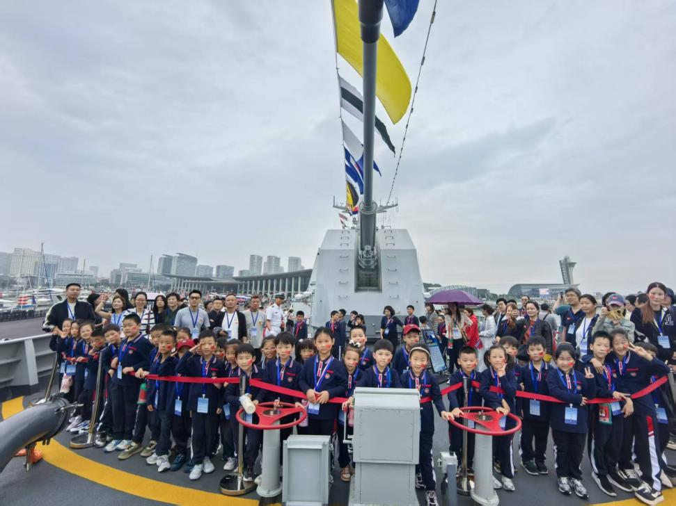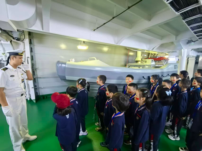 少先队员们依次排队登船参观,一睹大国重器的风采。在踏上甲板的那一刻,气势磅礴的舰体、先进的装备、光洁如镜的甲板,无不给队员们带来了强烈的视觉冲击力和心灵震撼。在海军叔叔的引导讲解下,大家切身感受到了大国重器所承载的科技力量与战略意义。参观舰艇后,队员们还在码头上学习体验了系绳结、打旗语、穿戴防火服和潜水装具等海军专属技能。