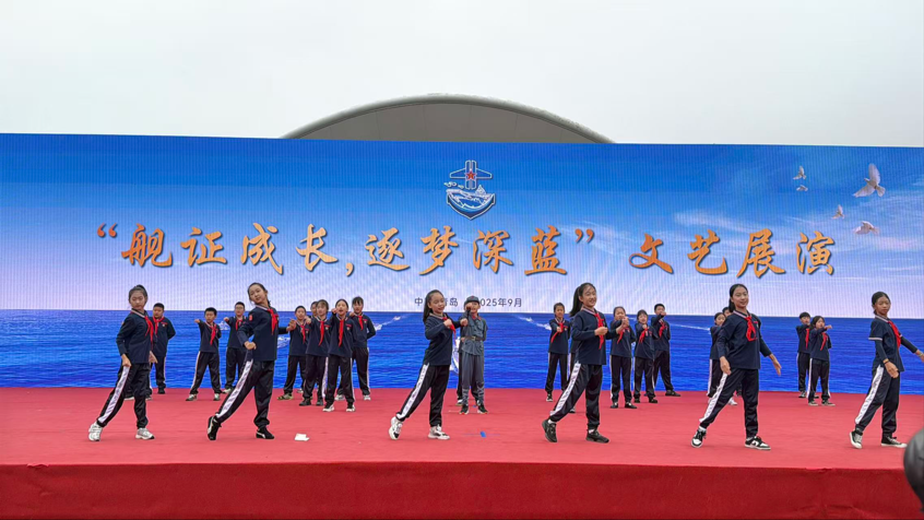 在“舰证成长,逐梦深蓝”青岛市中小学生文艺展演现场,新世纪学校五年级五班中队的孩子们将合唱《强军战歌》与穿越短剧巧妙融合,精彩的表演,赢得了现场观众的阵阵掌声。