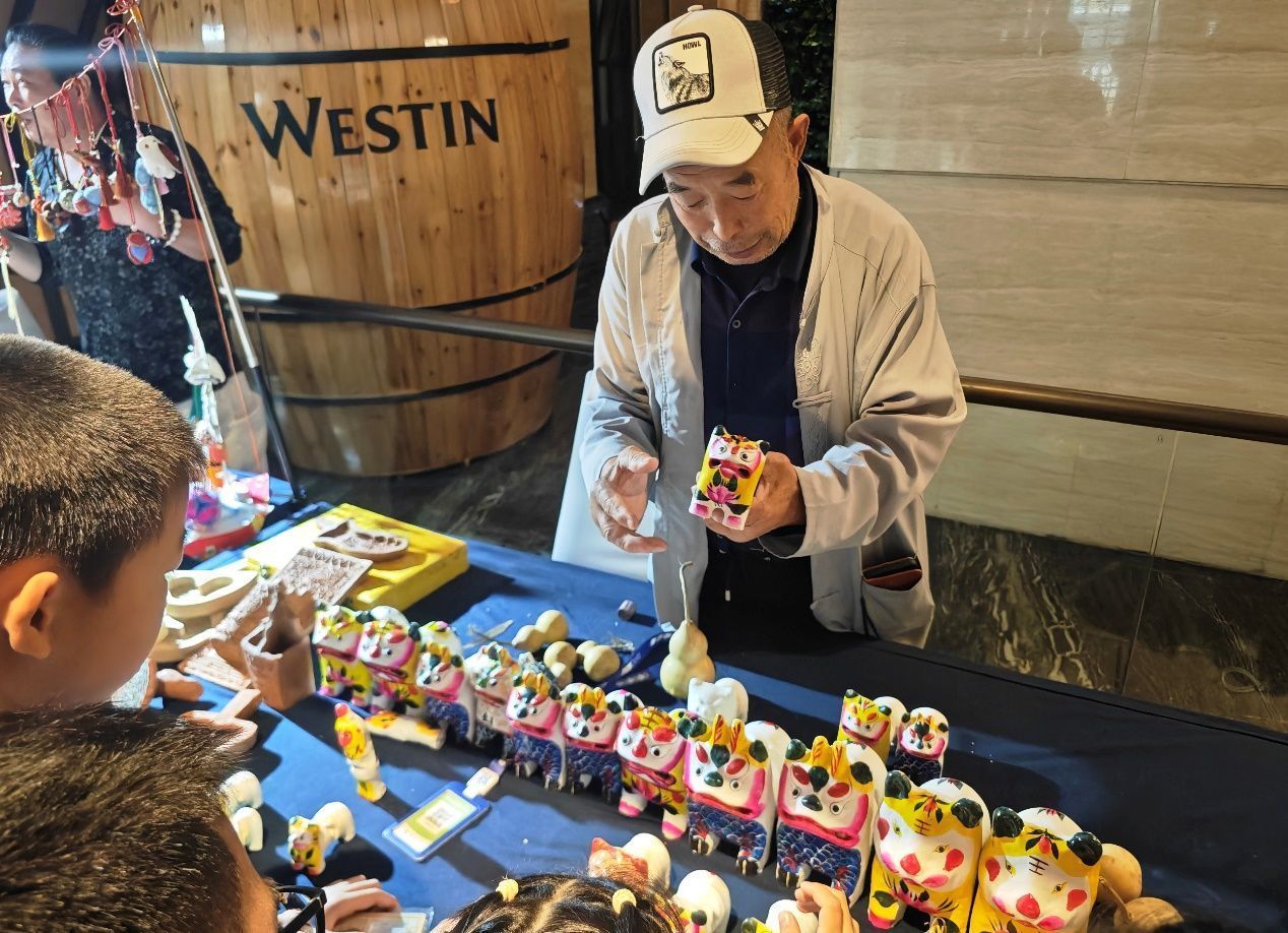 红陶与泥老虎展台前,红陶传承人李师傅耐心地讲解着泥料筛选、拉坯塑形的过程,“泥料必须仔细去除杂质,拉坯的时候手要稳,这样才能做出形状规整的红陶。”泥老虎色彩鲜艳夺目,传承人介绍道:“泥老虎以前常用于庆典活动,寓意着驱邪吉祥。”一位市民好奇地追问颜料会不会掉色,传承人则耐心解答,分享着制作的奥秘。