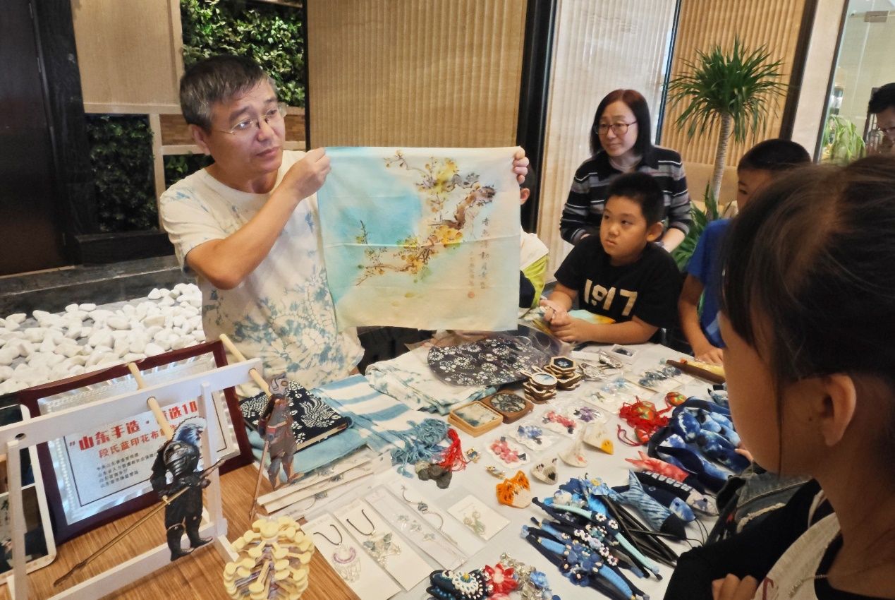 扎染展台上,色彩斑斓的扎染作品令人目不暇接。传承人段师傅为市民讲解头巾、围巾上晕染的似流云变幻的图案;小巧的胸针、发卡上点缀着的独特纹理等,还有风格各异的衣服、折扇,每一件都展现着扎染艺术的独特魅力。