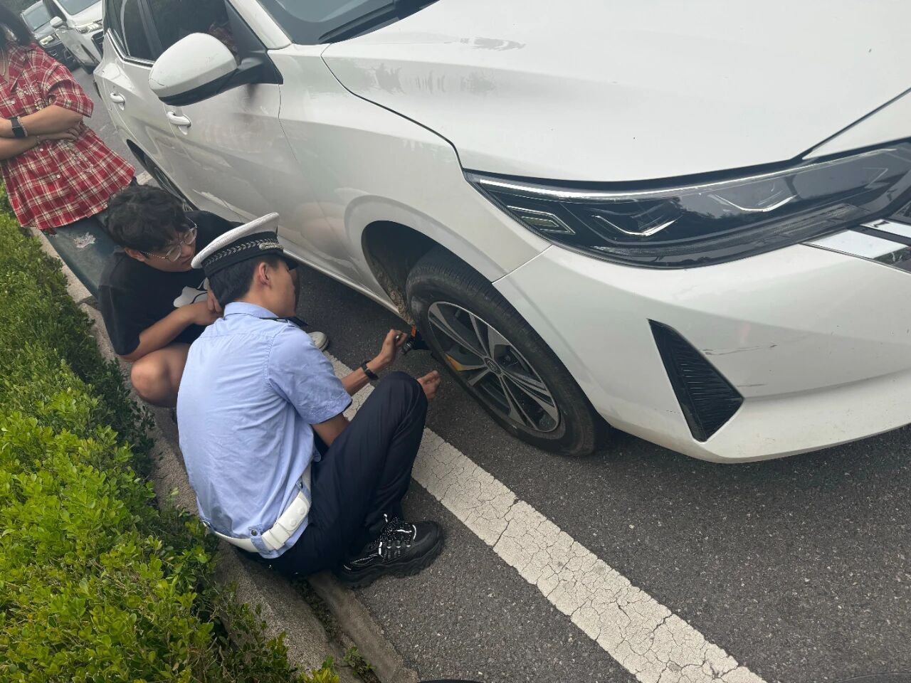 10月1日下午,正值国庆出行高峰,市交管支队黄岛大队交警在九龙山路巡逻时,发现一辆外地牌照轿车打着双闪停靠路边。经询问,车主因右后轮爆胎手足无措。交警迅速设置警示标志,化身“修车师傅”,熟练拆卸螺丝、更换备胎。不到半小时便解决问题,叮嘱安全后便又投入到繁忙的执勤中。