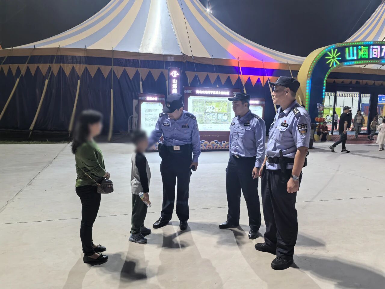 10月1日晚,明月山海间不夜城华灯璀璨,人流如织。李女士带着孩子游玩时,因接听工作电话,几分钟后发现孩子不见了踪影。在此执勤的青岛市公安局城阳分局河套派出所民警接到求助后,一边安抚李女士情绪,一边记录孩子特征,随即兵分两路展开搜寻。一组携带警用喇叭在娱乐区和小吃区反复播报,另一组协调园区广播扩大搜寻范围。约20分钟后,巡逻民警终于找到了孩子。李女士看到孩子后激动得紧紧抱住,连连向民警道谢。