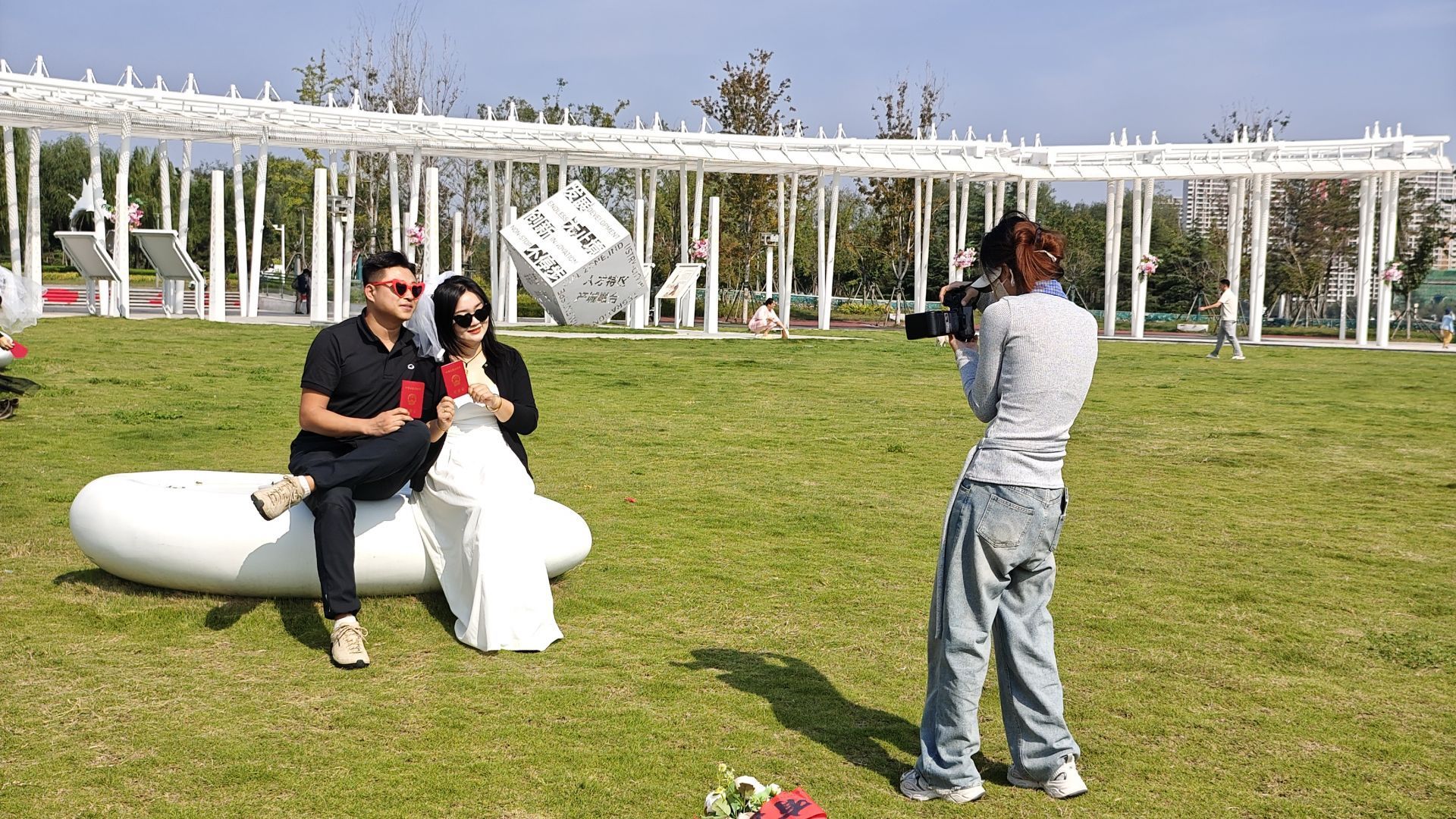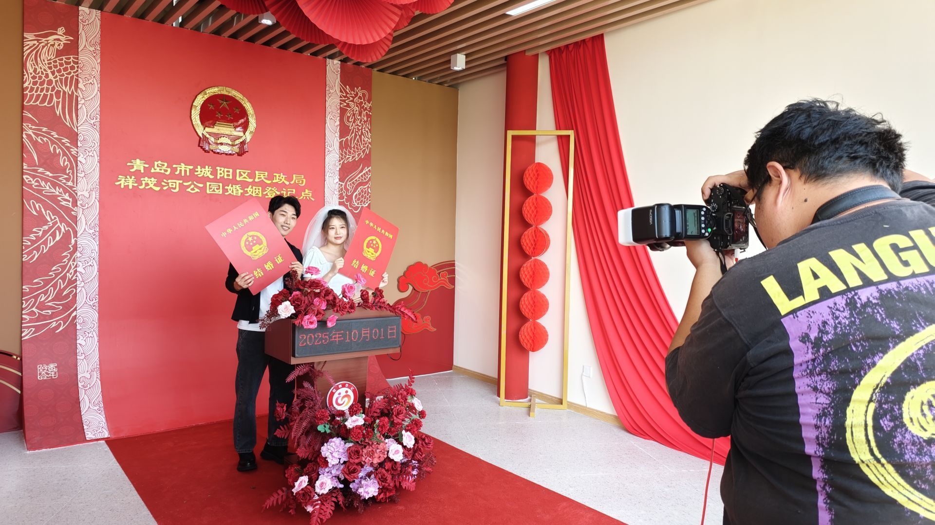 “我认为选择在国庆当天结婚很有纪念意义,包含着家国同庆的含义和祝福。”从李沧区赶来祥茂河公园办理结婚登记的孙先生告诉记者,他提前1个月就预约了跟拍摄影师,不仅可以记录幸福瞬间,还能在风景优美的祥茂河畔边旅边拍,让结婚登记更仪式感、神圣感与浪漫感。