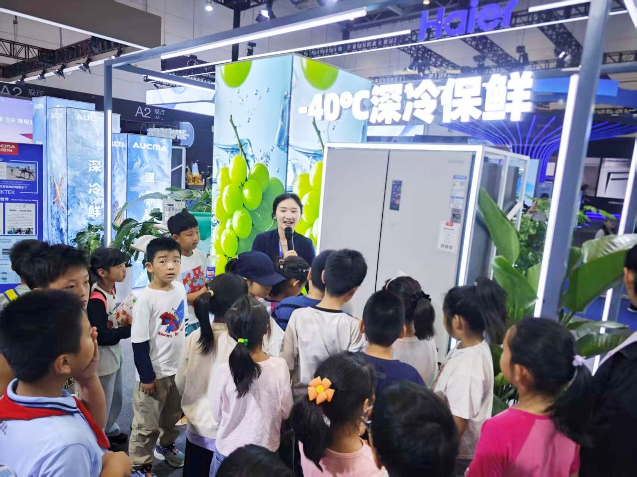 冷链与家电展区的硬核产品让大家驻足。-40℃深冷保鲜冰柜吸引所有人目光,林老师介绍:“它采用的深冷速冻技术能实现食材细胞级保鲜,最大程度保护食材营养和口感。”旁边的平嵌鲜活冰箱同样亮眼,以法式四门平嵌冰箱为例,超薄机身实现厨居一体化。全新2:5冷冻分区设计实用:上层抽屉适配速冻水饺、冰淇淋等高频率小件食材,下层宽深抽屉可收纳整只羊腿、整鸡整鱼。更出色的是,-36℃深冷锁鲜技术能锁住食材原鲜,升级的低氧保湿舱与零晶恒鲜舱,让绿叶菜保鲜期延长3倍,鲜肉无需冷冻也能存放7天。“妈妈再也不用担心蔬菜和肉很快变质了!”小记者纷纷发出这样的感叹。