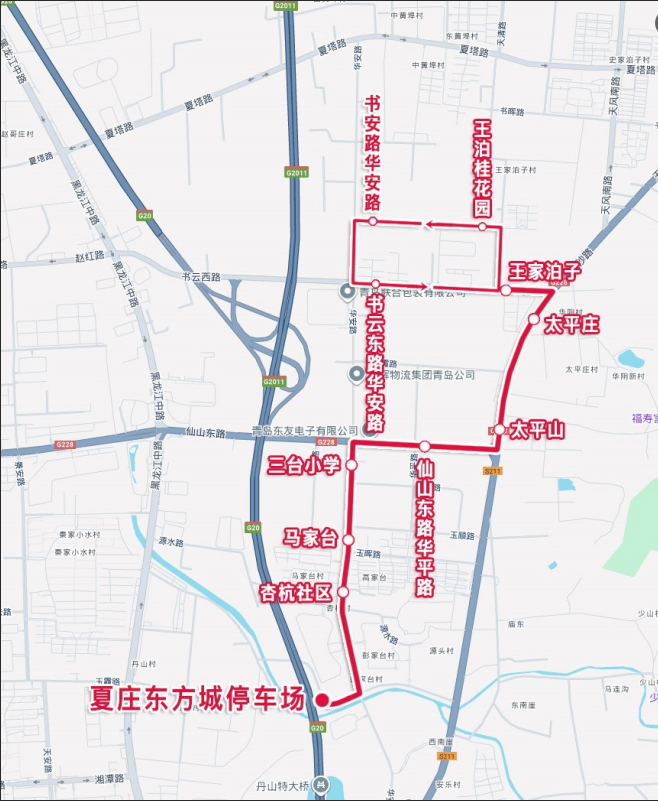 往夏庄东方城停车场方向:自“书安路华安路”返程站,沿书安路、华安路、书云东路、王沙路、仙山东路、华安路、乐水路、乐水支路至“夏庄东方城停车场”站止。