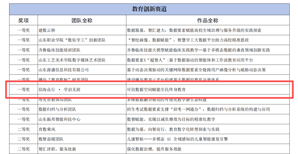 近日,2025年“数据要素X”大赛山东分赛组委会公布了决赛获奖名单,青岛开放大学参赛作品《可信数据空间赋能全民终身教育》荣获教育创新赛道一等奖,实现在教育大数据领域省级权威赛事中的首次突破。