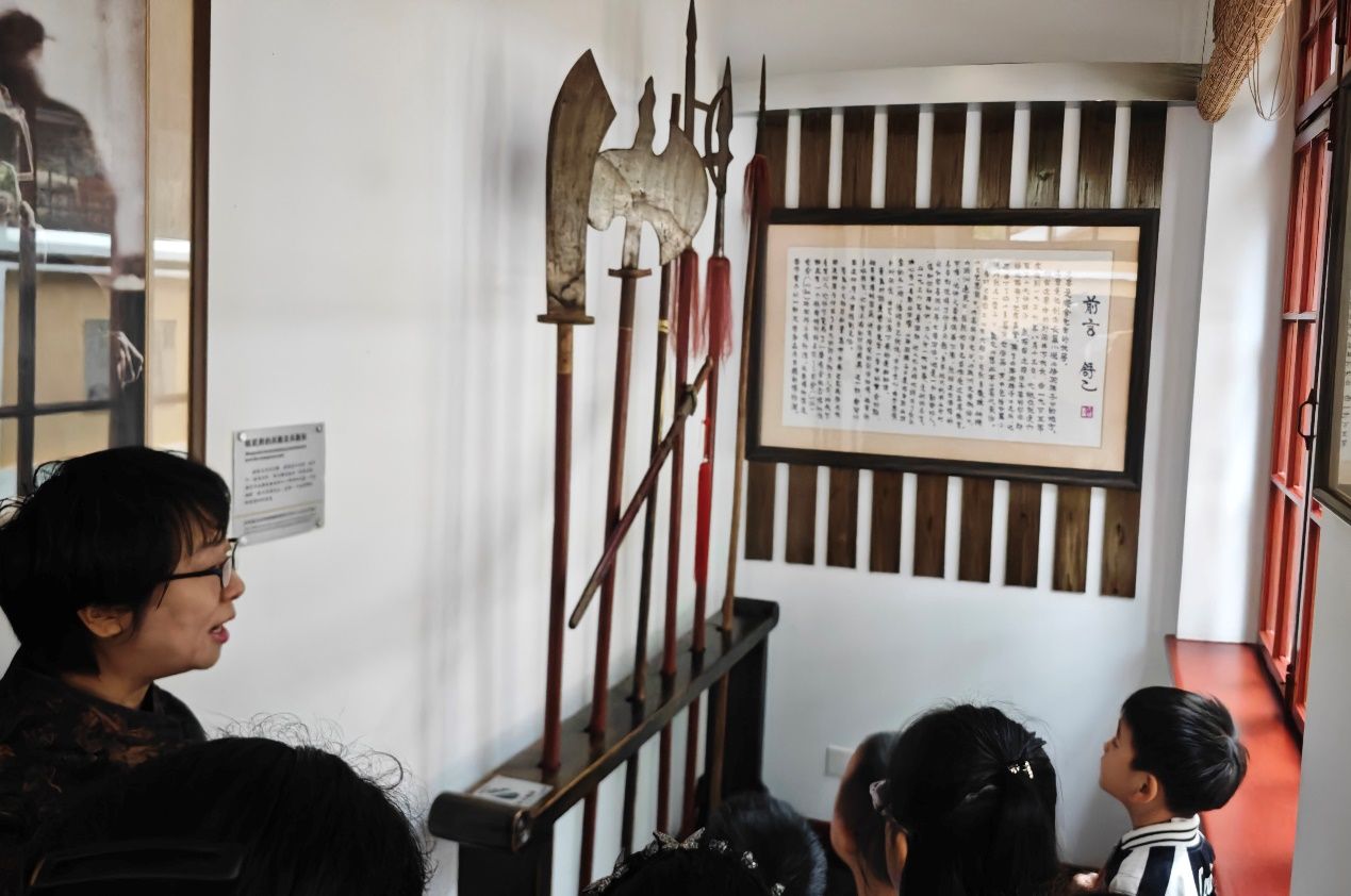 研学之旅从序厅拉开帷幕。前言墙旁,一组古色古香的兵器架格外醒目,兵器排列整齐。“老舍先生不仅是一介书生,更是位‘武林爱好者’。”王咏馆长指着兵器架介绍道,老舍在青岛居住时每日坚持练武,风雨无阻,这种坚韧毅力也融入了《骆驼祥子》的创作中。