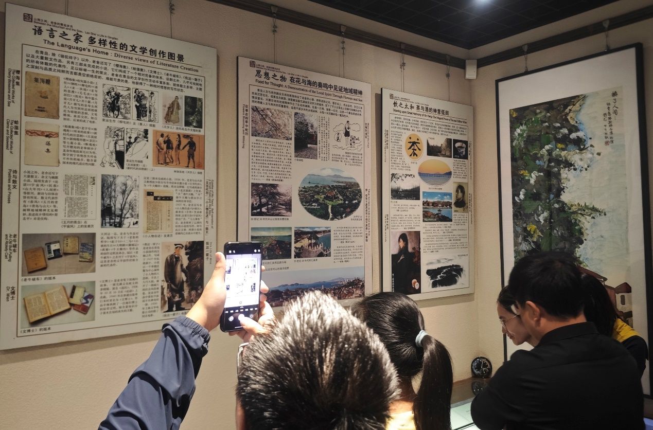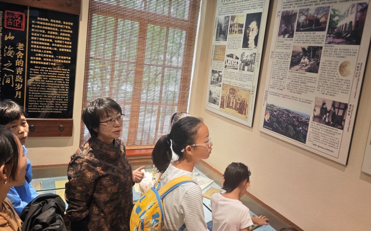 青岛厅里,一幅幅老照片、一段段文字讲述着老舍与青岛的不解之缘。除了《骆驼祥子》,老舍在此期间还创作了《樱海集》《蛤藻集》《我这一辈子》等经典作品。王咏馆长结合展墙上的散文片段,讲述老舍如何将青岛的山海风光、市井烟火融入创作。 “原来我们身边的街道、海风,都曾激发过文学大师的灵感!”一位小记者兴奋地说道。