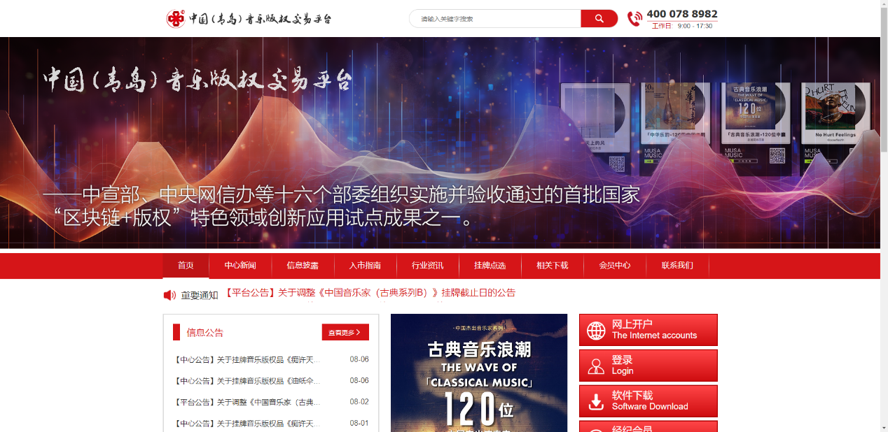 音乐版权全产业链交易服务平台则由青岛文化产权交易中心牵头建设,引入区块链及大数据等先进技术,聚焦音乐产业综合服务领域,依托数字版权交易、区块链技术、音乐大数据服务等方面突出优势,围绕版权登记、存证确权、授权转让、交易结算、版权监测、侵权取证、诉讼维权等环节为音乐产业提供从产出到维权的一站式、全链路的创新服务。平台于2022年入选中央网信办、中宣部等十六部门组织开展的国家“区块链创新应用试点”,并于2024年顺利通过验收。