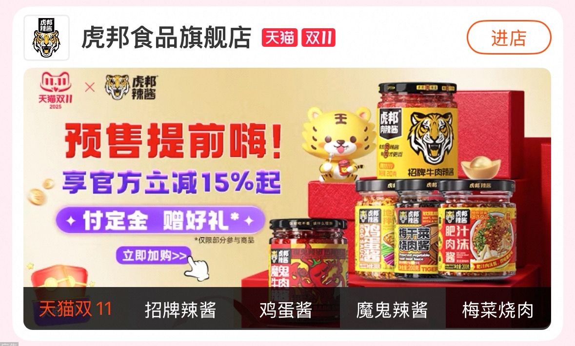 据悉,成立于2015年的青岛辣工坊食品有限公司,自2016年创立“虎邦”品牌以来,已构建起从研发、生产到销售的全产业链布局。至目前,2024年销售额已经达到6亿元人民币。而2025年“双11”,虎邦更是自信冲击3000万元周期性销售指标。