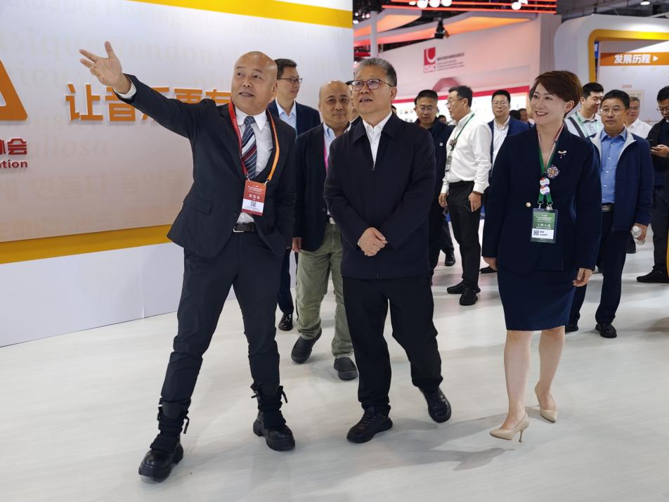 中宣部版权管理局局长王志成(左二)来音集协展位调研,音集协副理事长兼总干事周亚平(左一)作展位介绍。