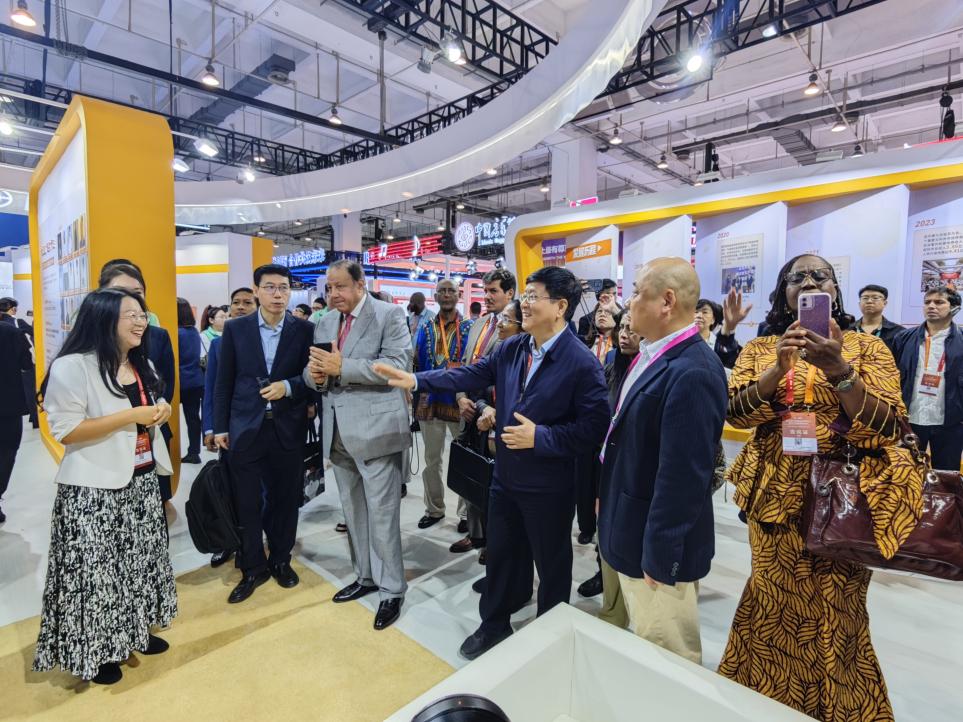中宣部版权管理局副局长、一级巡视员汤兆志(右三)带领外宾团来我会展位参观,音集协副总干事国琨(左一)作展位介绍。