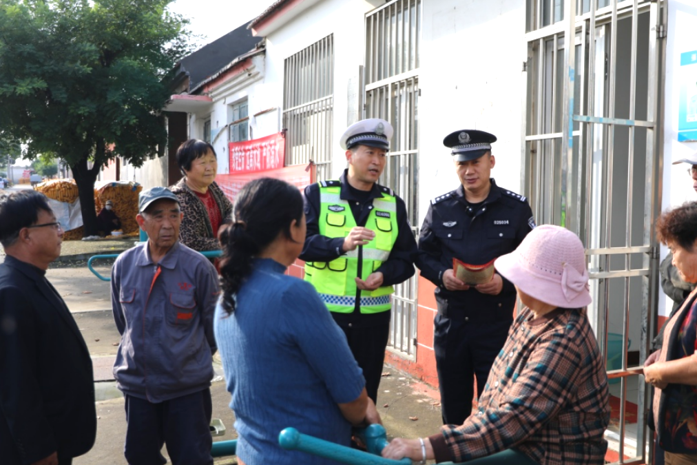 “大叔,骑电动车一定要戴头盔。”“大姨,这是防诈骗的知识您看看……”10月13日,在平度市田庄镇一村庄,派出所民警和交警一起向群众发放宣传材料,面对面讲解交通安全知识和反诈骗常识,增强群众的安全防范意识。