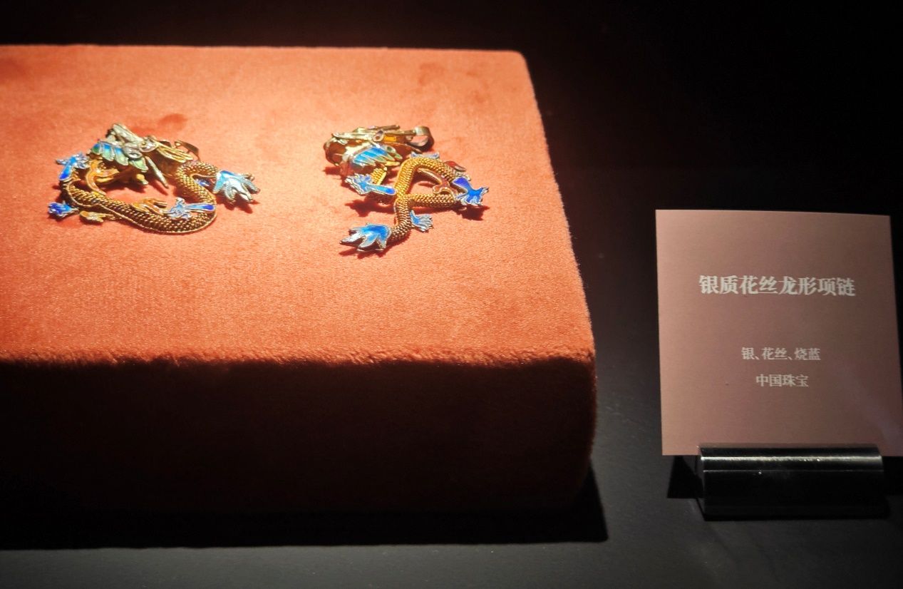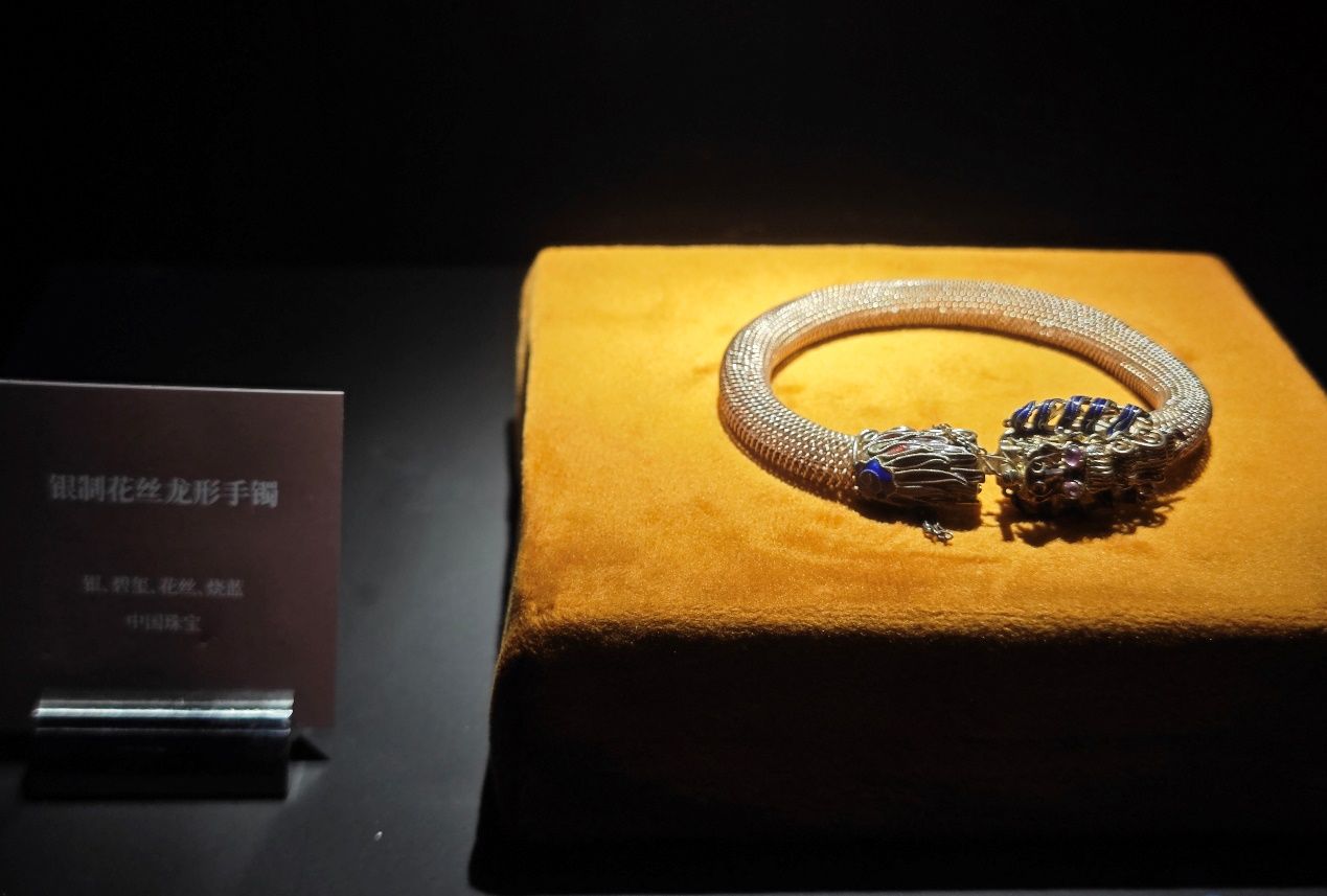 东方风华展区则让小记者们感受到了本土工艺的魅力。中国花丝镶嵌的游龙纹手镯上,毫米金丝编织的龙鳞栩栩如生,粉色碧玺点缀的龙睛更添灵动。王馨茗副馆长告诉大家,即便在战乱时期,民国工匠仍用料器仿制翡翠,以琉璃经硼砂染色延续本土智慧,这种“以形载意”的造物哲学让小记者们深深动容。隔壁的日本珠宝展区,樱花胸针既展现了“寂”美学,又让大家领略到东方极简主义的独特韵味,体会到不同文化背景下珠宝艺术的多元表达。