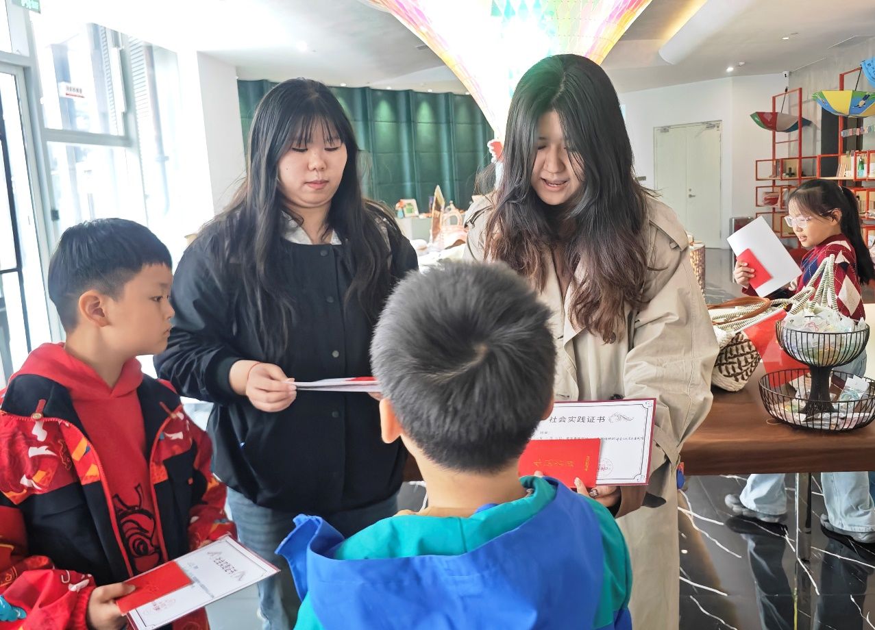 青岛若七珠宝文化艺术博物馆副馆长王馨茗(右)和青版教育的苑梦老师(左)向小记者发放研学证书。