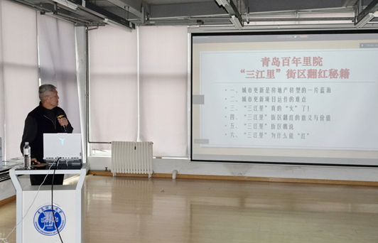 研讨会现场,青岛理工大学教授、青岛市城市建设文化交流协会副会长、青岛理工大学建筑学院原院长徐飞鹏,进行了《青岛历史城区中轴线——青岛路遗产景观修复修正研究》主题分享;青岛太平洋学会顾问、青岛市社会科学研究院研究员,文史专家张树枫,进行了《青岛城市更新与城市文化保护》专题演讲;青岛市生产力学会常务副会长兼秘书长、中国社科院特邀房地产专家冯显泉,则带来了调研报告《青岛百年里院“三江里”翻红秘籍》,并进行了精彩交流分享。