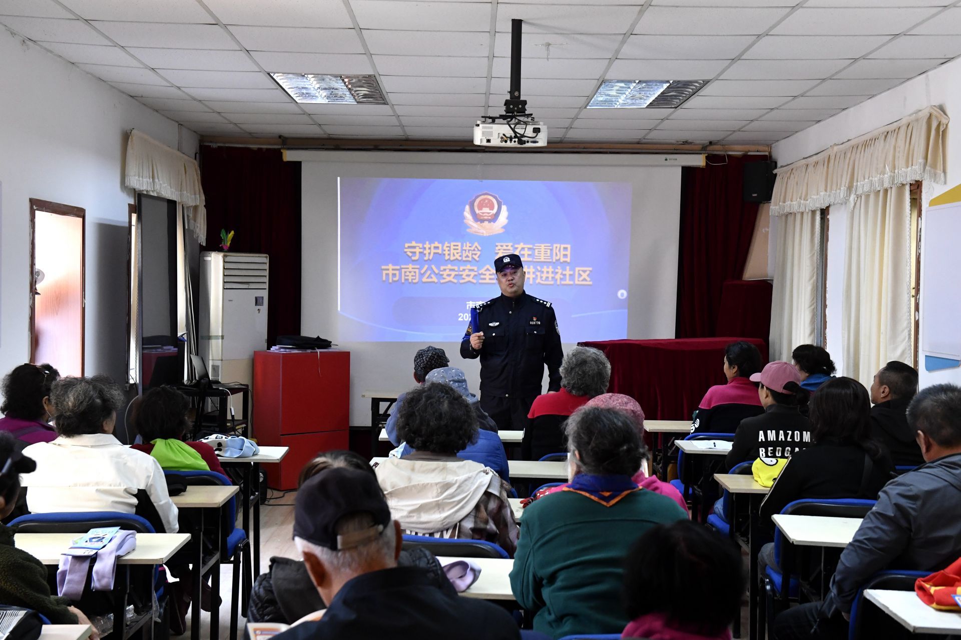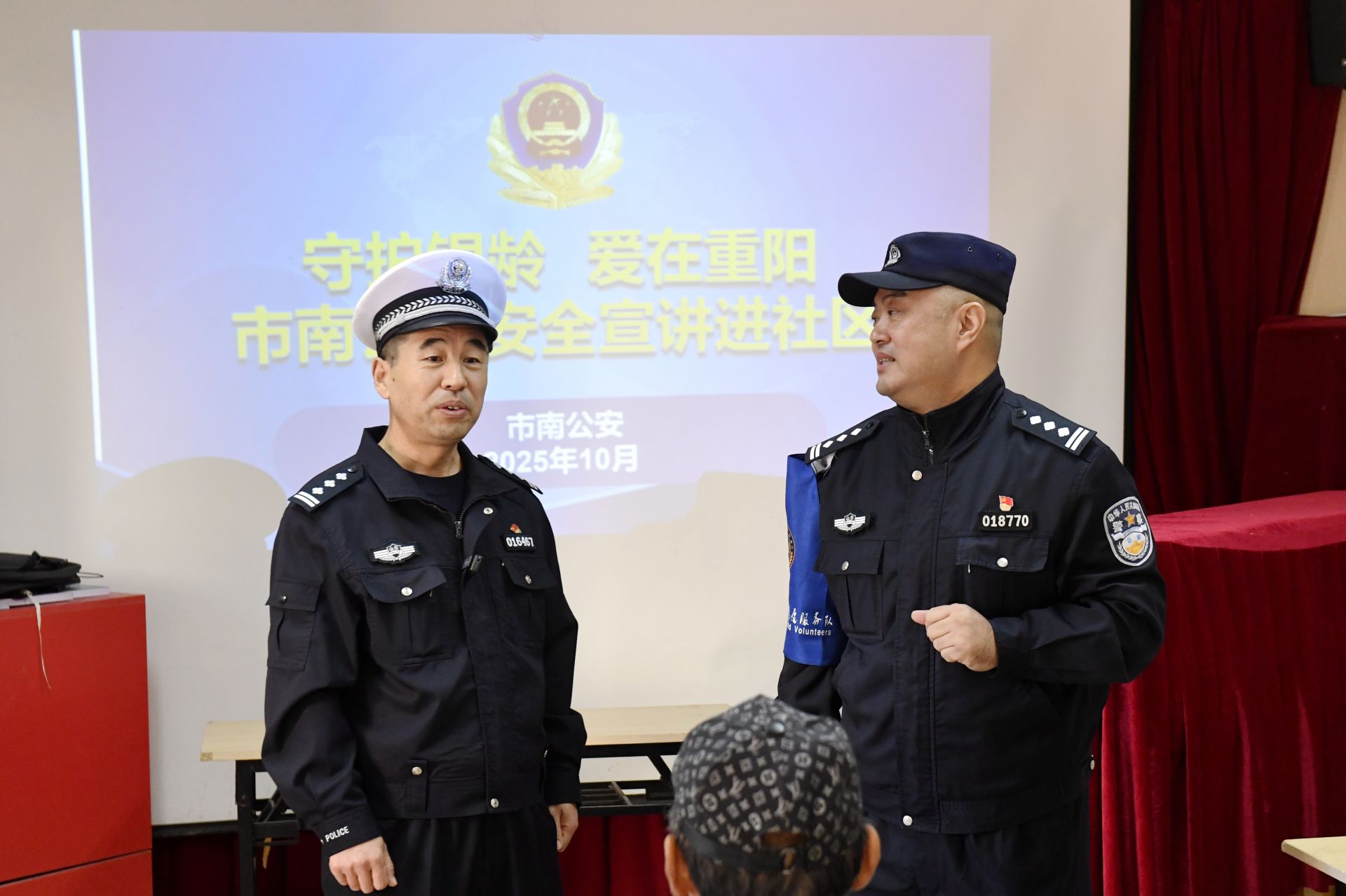 重阳节前夕,青岛市公安局市南分局反诈中心与青岛市公安局交通管理支队市南区大队携手,先后来到青岛市市南区金口路社区、天台路社区,以“守护银龄 爱在重阳”为主题,用“唠家常、说实事”的亲切方式,为社区老人带来一堂既有“干货”又有温度的安全防护课,从出行平安到财产安全,全方位为“银龄老人”筑起安心屏障。